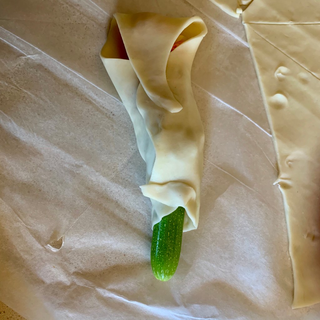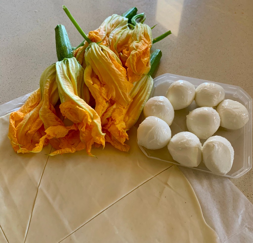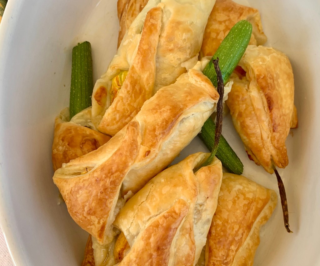 Ho diviso in 8 spicchi il rotolo di pasta sfoglia dopo averla un pò ‘appiattita’ con il matterello. Ho aperto delicatamente ogni fiore per togliere li stami all’interno, che darebbero un gusto amaro. In questo caso pazienza se rompete il fiore, tanto poi andrà avvolto e sigillato nella pasta sfoglia.