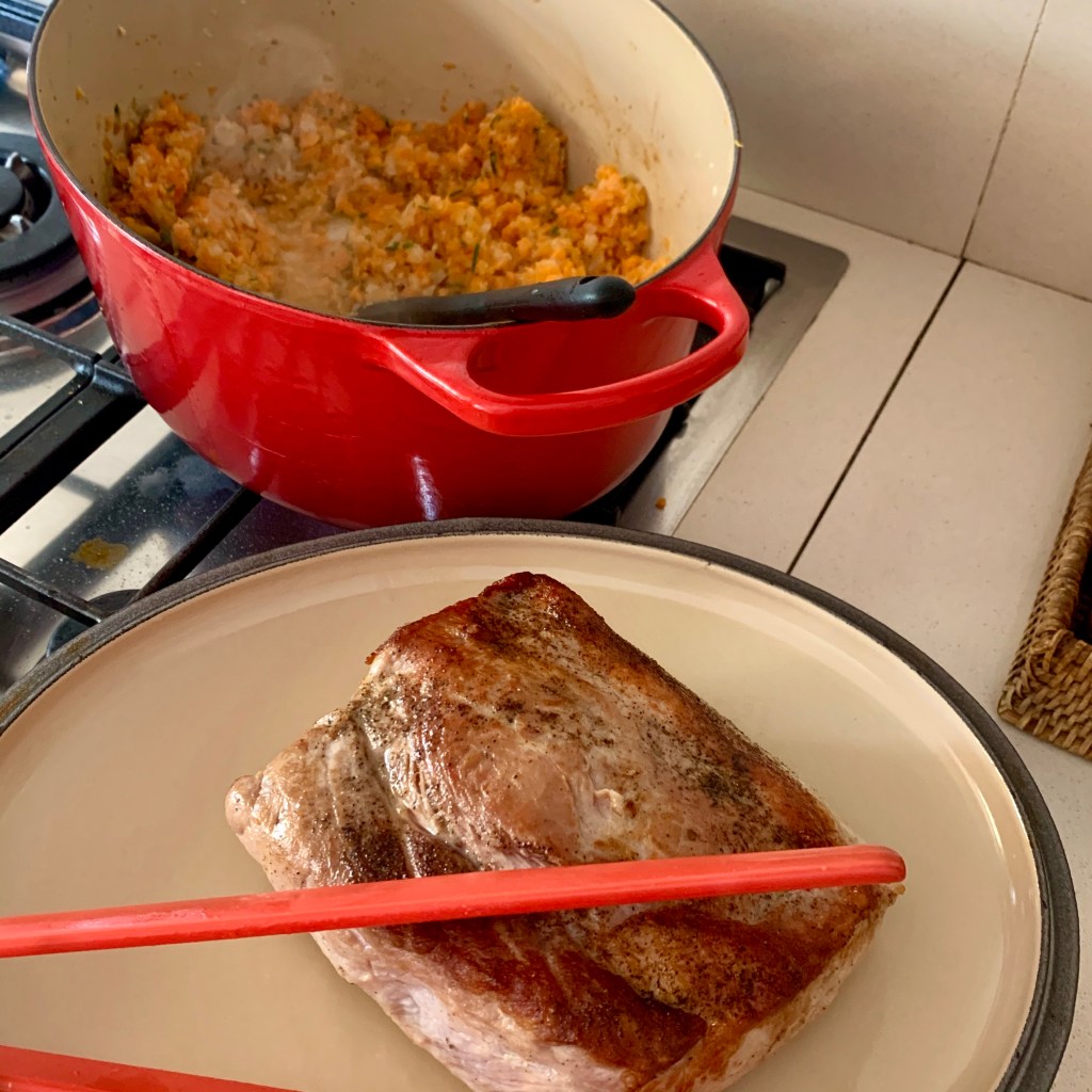 Ho cominciato facendo rosolare bene la carne in tutte le sue parti dopo averla salata e pepata. Intanto nel mixer ho tritato fine fine la cipolla, la carota, l’aglio con il rosmarino fresco e 2 foglie di alloro.