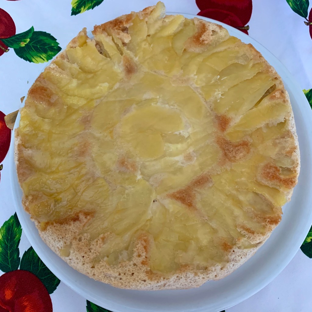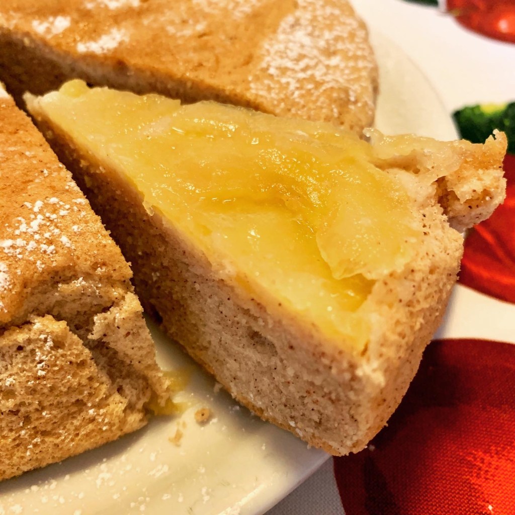 Una volta disposte le fettine di mele, rovesciate sopra il vostro impasto. Cuocete a 180 gradi ventilato per circa 35 minuti.