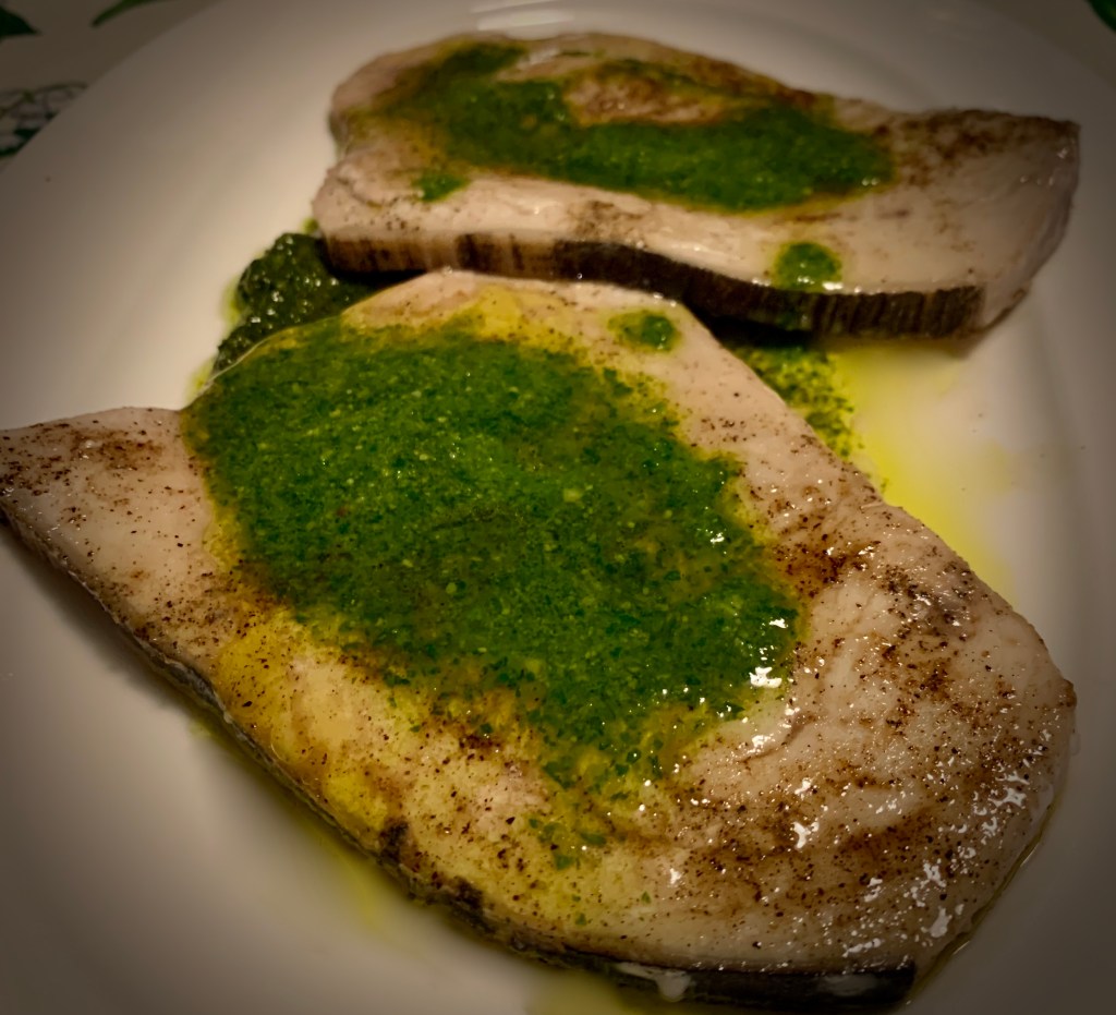 Ci sono ricette che nascono per caso, da un idea che arriva osservando ciò che c’è in frigo. A volte il risultato è mediocre, ma a volte… diventano cavalli di battaglia. Questa ricetta è nata da una associazione di idee: in pizzeria con amici qualcuno aveva ordinato la pizza al tonno con il pesto. Qualche giorno dopo avevo del pesce spada da cucinare che non volevo fare come sempre alla pizzaiola o semplicemente arrosto. Avevo in frigo un piccolo vasetto del mio pesto, così decisi di provare a replicare l’abbinamento visto sulla pizza, ma sostituendo il tonno con il pesce spada. La prima volta ho provato a passarlo un minuto al microonde e poi condito con il pesto, ma si è asciugato e ha perso molto nel gusto, ma ero giovane e inesperta. Oggi non metterei mai il pesce nel microonde!