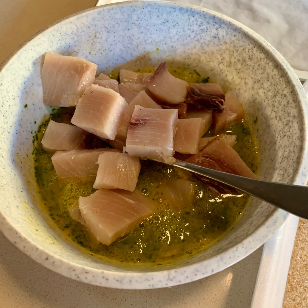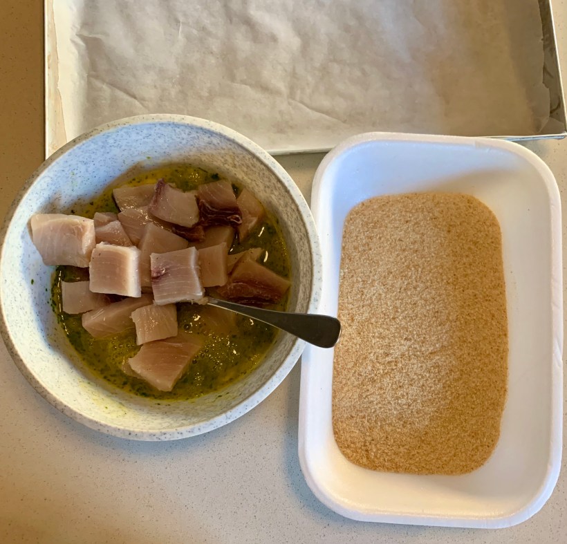 L’altra sera avevo una trancia in esubero rispetto ai ‘commensali’ e così ho deciso di prepararla impanata, ma, per non friggere, l’ho cotta al forno con veramente pochissimo olio. Quindi ho sbattuto 2 uova con due cucchiai di trito di prezzemolo e aglio, una presa di sale e una di pepe. Vi ho immerso il pesce che avevo tagliato a cubetti.