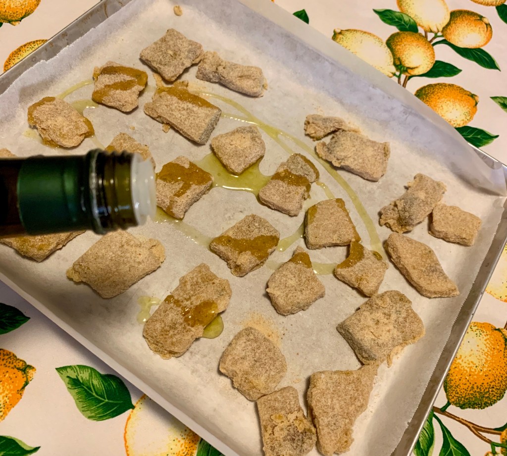 Li ho passati nel pane grattato e disposti sulla teglia foderata di carta forno. Ho portato la temperatura del forno a 200 gradi e solo allora ho infornato per circa 8 minuti, giusto il tempo che la panatura si colorasse.