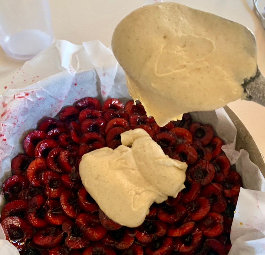 Come ho raccontato giorni fa questa torta l’ho preparata come ‘riserva’ nel caso che quella al lime non fosse riuscita bene. L’unica, diciamo, difficoltà, è preparare le ciliegie: dividerle in due e togliere il nocciolo, fatelo con i guanti o le mani saranno poi un disastro!