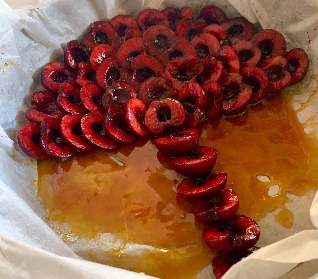Ho foderato la teglia con la carta forno e versato il caramello, sopra ho disposto le ciliegie strette strette, sovrapponendole un pochino, il caramello vi aiuterà a tenerle ‘in posizione’.