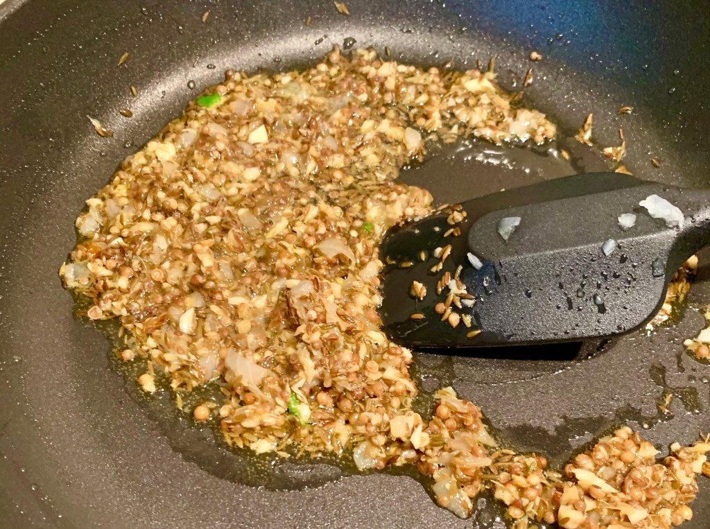 Con il tritatutto sminuzzate lo zenzero pelato, i frutti ( o semi) di coriandolo, l’aglio e la cipolla. Fate scaldare l’olio in una padella antiaderente, aggiungete i semi di cumino all’olio e fate andare per qualche minuto.