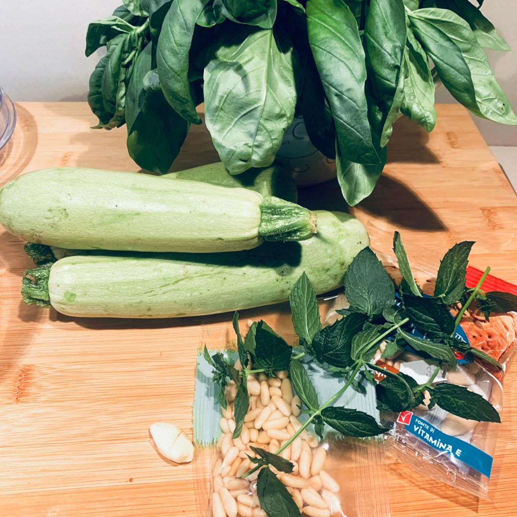 Ieri sera spaghettata dell’ultimo momento. Faceva ancora troppo caldo per rifugiarsi nel confort di una amatriciana o una carbonara. In frigo avevo delle zucchine, qualche costola di sedano … la menta è rifiorita nel vaso, e vada per il pesto di zucchine: veloce, si prepara a freddo, freschissimo. Troverete in giro la ricetta, con qualche variante, quella che segue è la mia versione, con la menta fresca e i pinoli.
