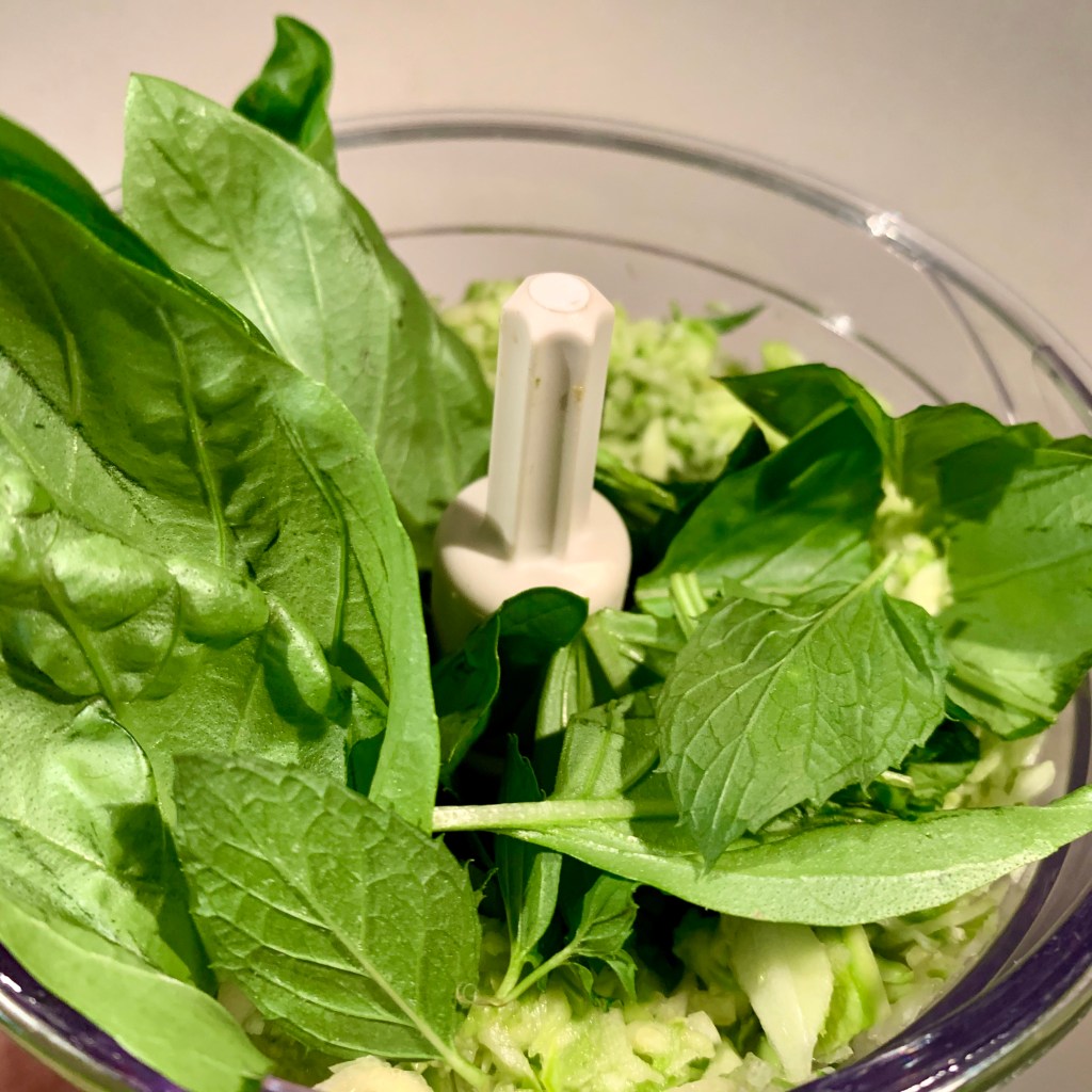 Ho tagliato per lungo le zucchine e poi a tocchetti, eliminando un pò di semini da alcune. Ho messo tutto nel tritatutto con un pizzico di sale grosso, la menta, il basilico, l’aglio e i pinoli. Ho fatto andare le lame a singhiozzo e poi ho aggiunto il formaggio, la costola di sedano a tocchetti e l’olio.