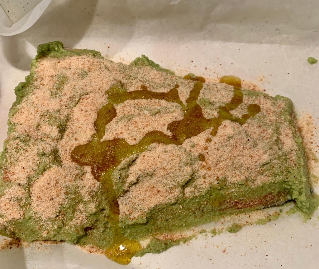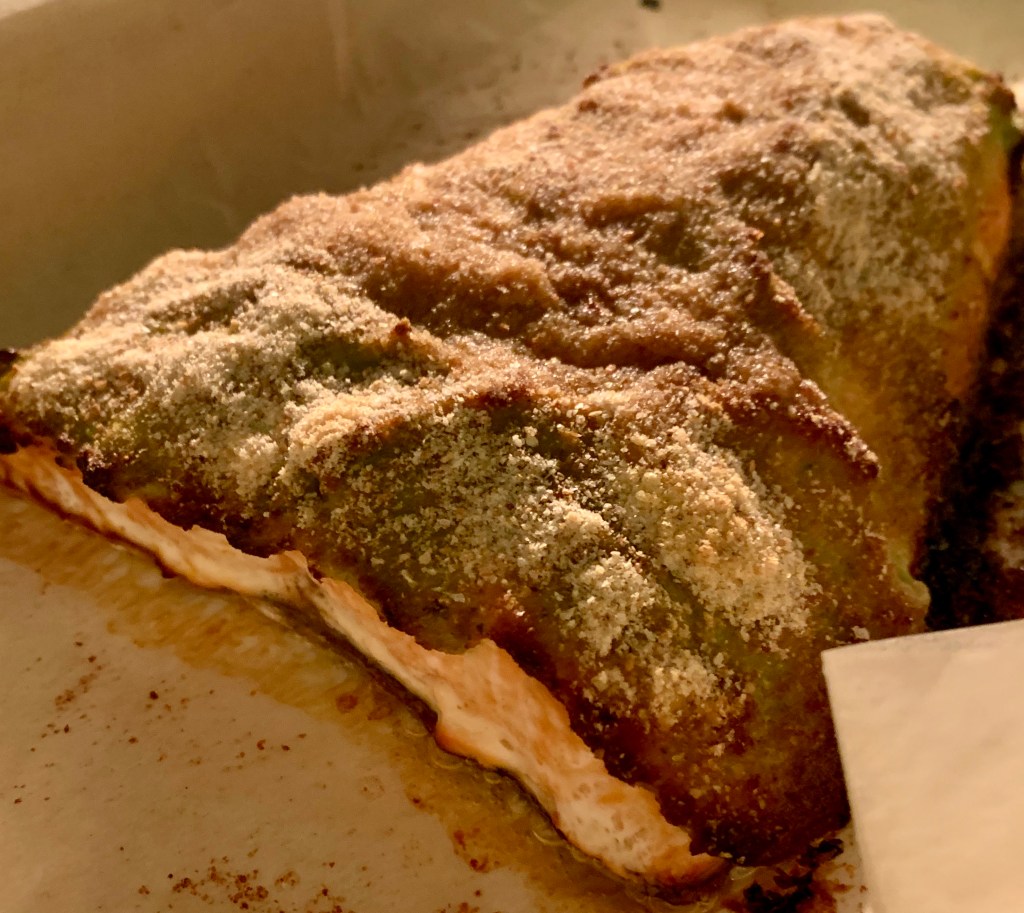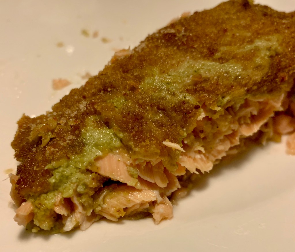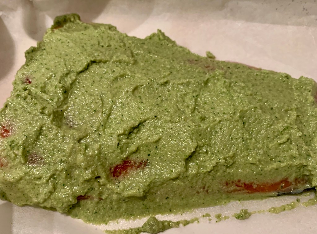 Vi assicuro che è buonissimo, la freschezza del pesto accompagna benissimo la ‘burrosità’ del salmone. La parte esposta del pesce era croccante ma l’interno si scioglieva in bocca. Sicuramente da rifare!