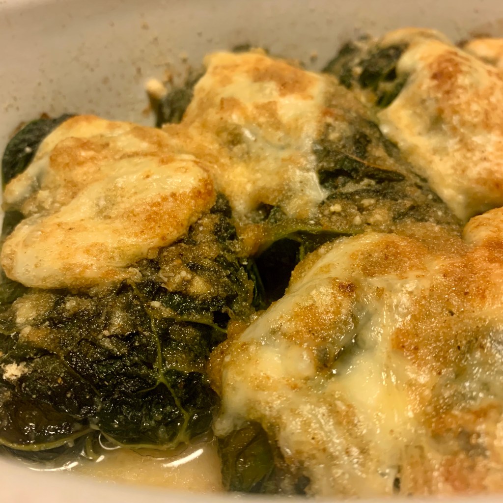 Non volendo eccedere con i grassi ho sbollentato le grandi foglie verde scuro per qualche minuto e poi le ho farcite con prosciutto cotto e provola, le ho arrotolate e poi cotte in forno cosparse di pan grattato e poco formaggio. Buone eh! Ma abbastanza anonime, infatti si usa imbottire questi involtini con la salsiccia, ma i miei programmi sono di alleggerire di molto la nostra dieta dopo le feste.