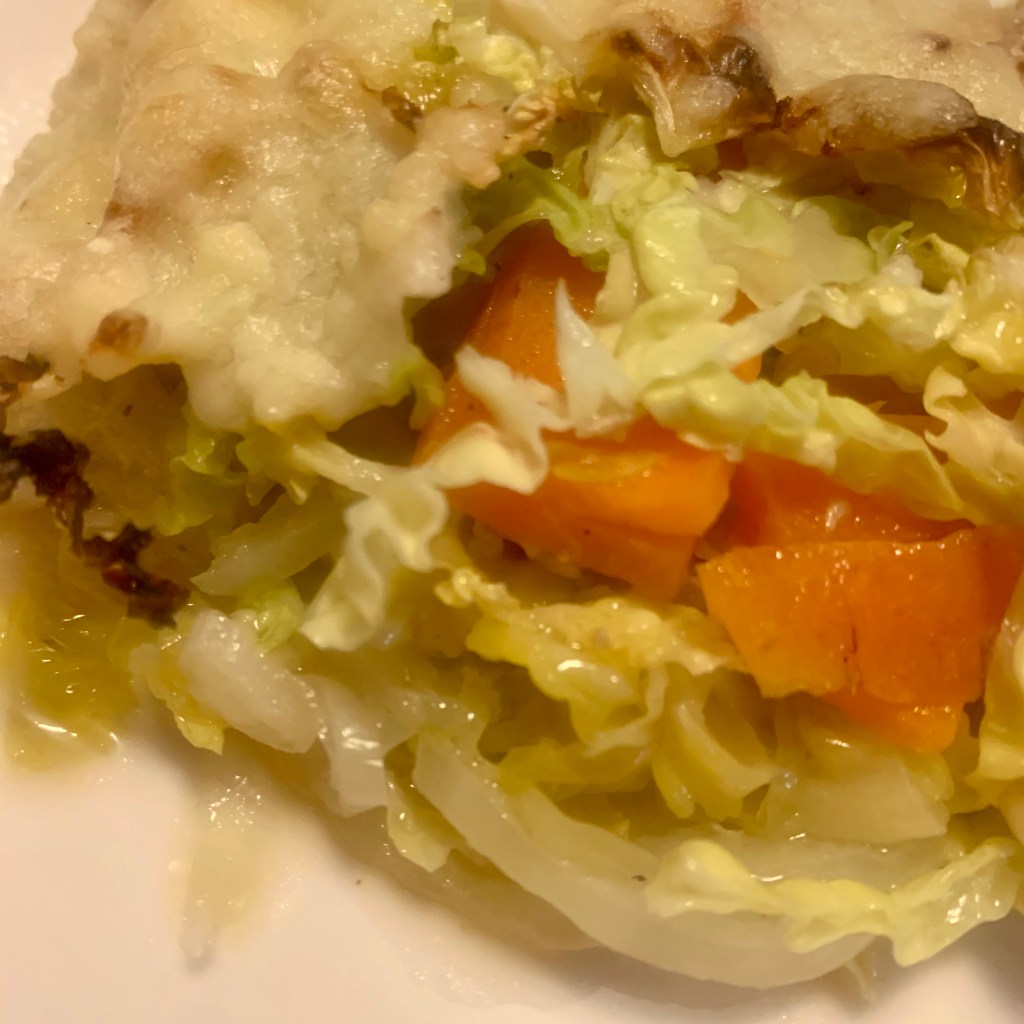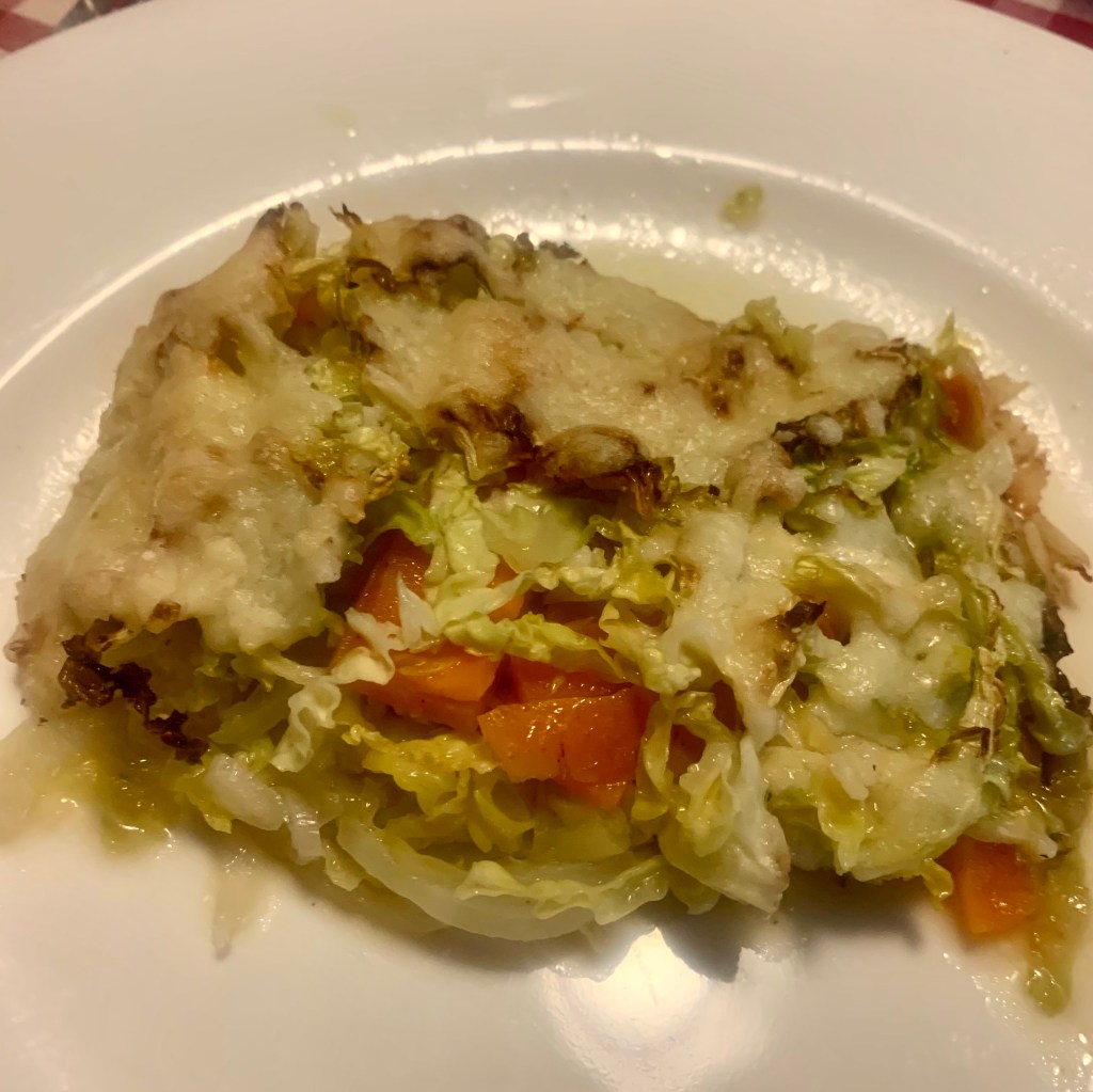 Ho affettato finemente il cavolo e le altre verdure. Ho disposto un primo strato di verza, condito con sale e pepe. Sopra ho disposto tutta la cipolla e poi tutte le carote. Ho quindi aggiunto sopra la verza restante, un poco di pepe e infine i formaggi a coprire il tutto.