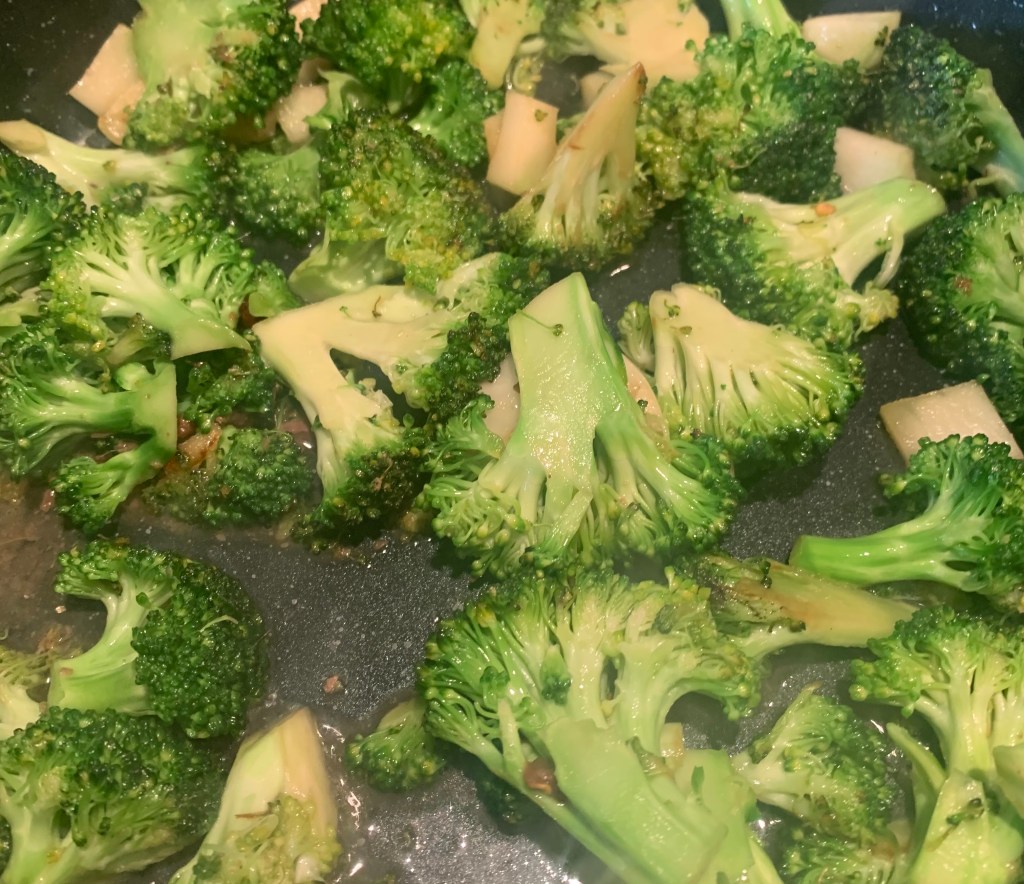 Ho lavato e tagliato a fette grossolane le cime dei broccoli. In una padella capiente con qualche cucchiaio di olio ho fatto colorire gli spicchi d’aglio e sciogliere le acciughe. Ho aggiunto i broccoli, condito con poco sale e un poco di pepe nero. Ho lasciato cuocere a fuoco basso, coperto, sino a che la verdura non è diventata tenera.
