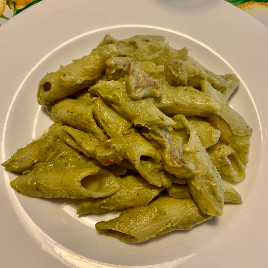 A questo punto ho trasferito tutto nel mixer ed ho frullato, ottenendo una crema che ho ammorbidito con qualche cucchiaio di acqua della pasta.