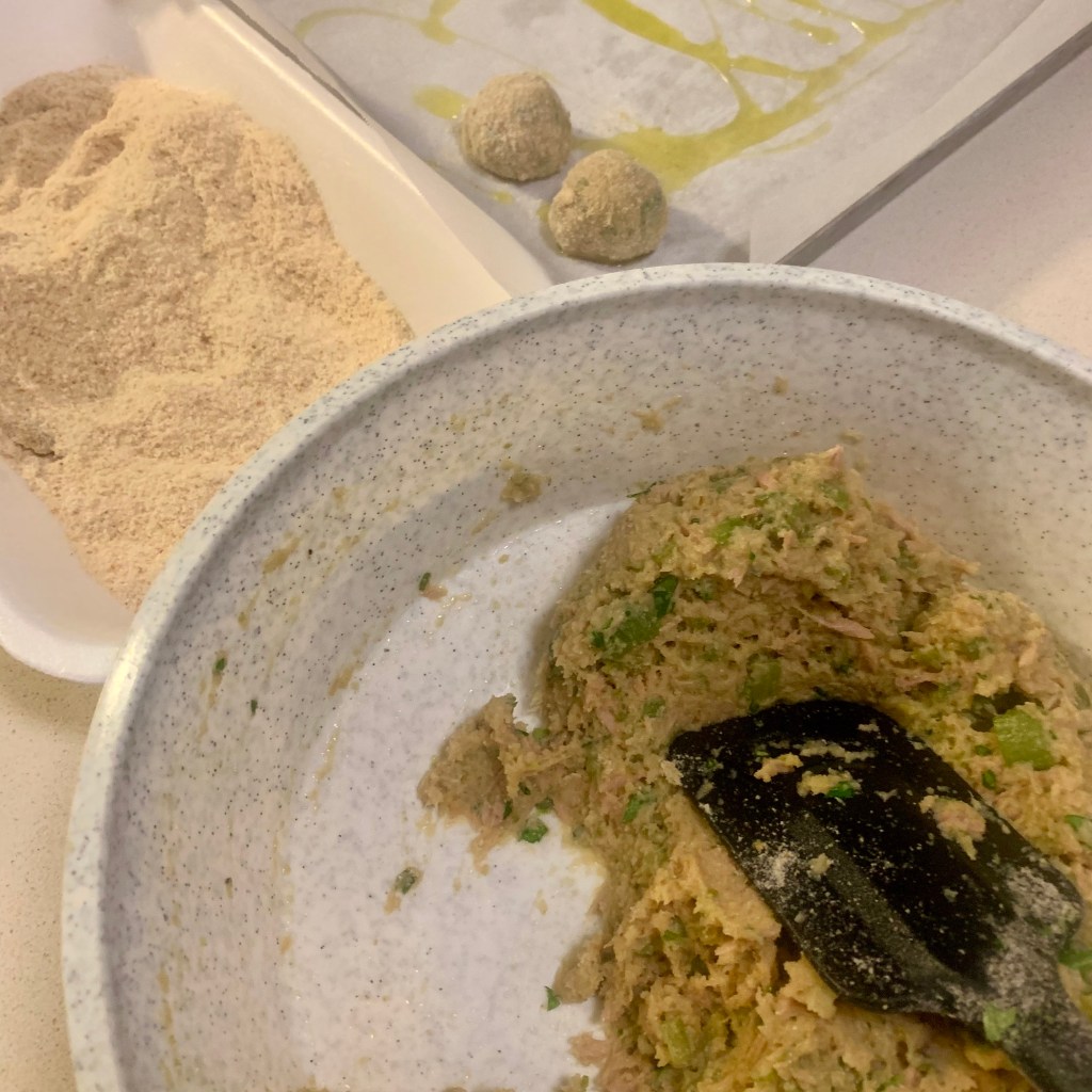 Quindi le ho messe in una ciotola, le ho schiacciate con il cucchiaio, ho aggiunto l’uovo, il prezzemolo, il pane ammollato nel latte. Infine ho unito il tonno, sbriciolandolo con le dita, amalgamando bene il tutto. Se vi risulta troppo morbido potete aggiungere del pan grattato.