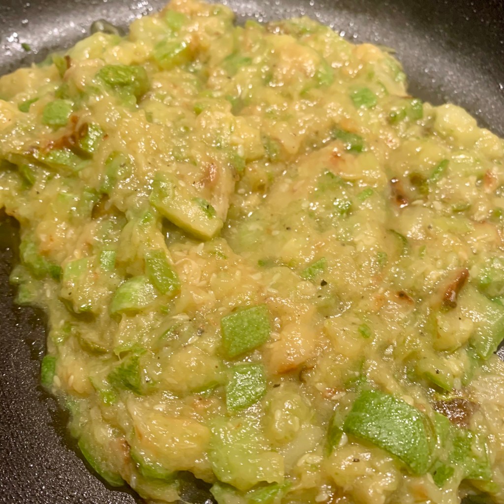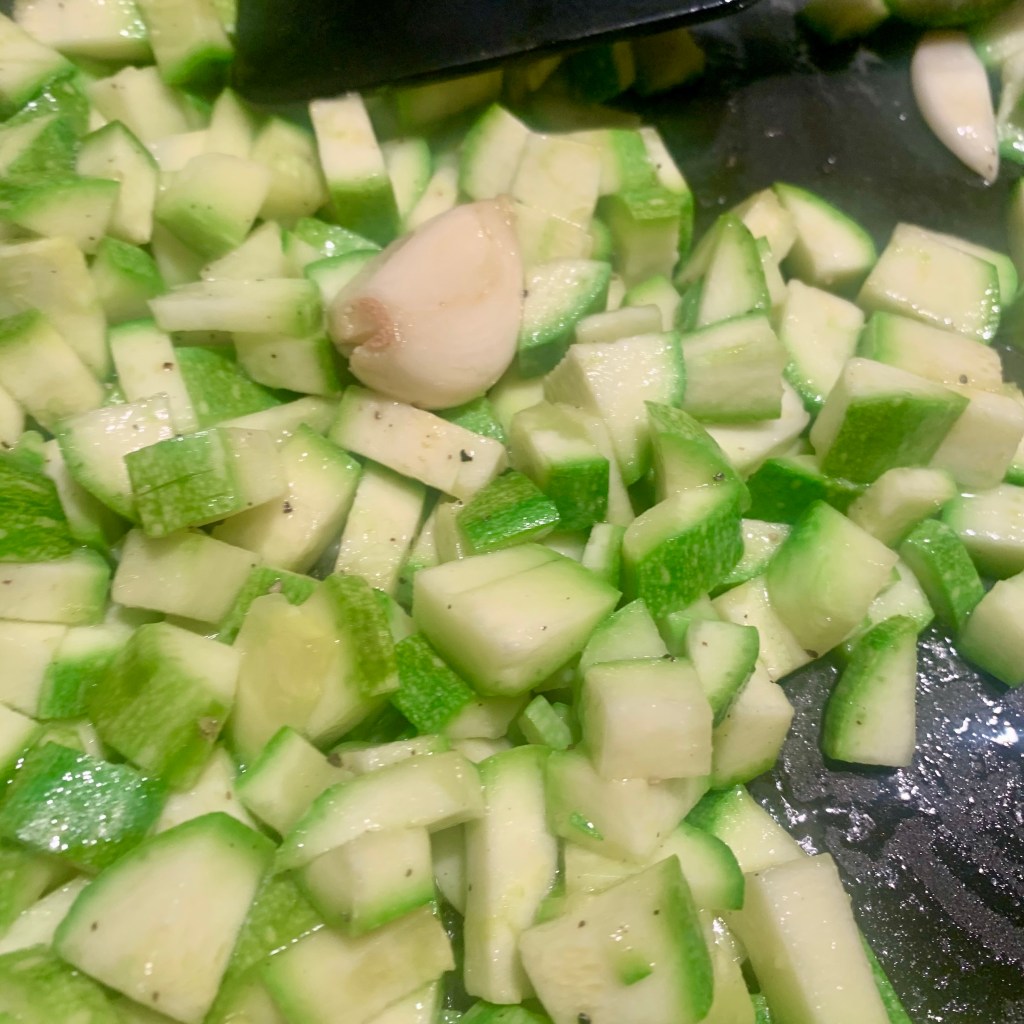 Ho lavato e tagliato a piccoli cubetti le zucchine. In una padella ho fatto colorare gli spicchi d’aglio, ho aggiunto le zucchine, condito con sale e pepe e ho coperto. Ho lasciato cuocere a fuoco basso sino a renderle tanto morbide da poterle schiacciare con il cucchiaio, non importa se qualcuna si colorisce un pò.
