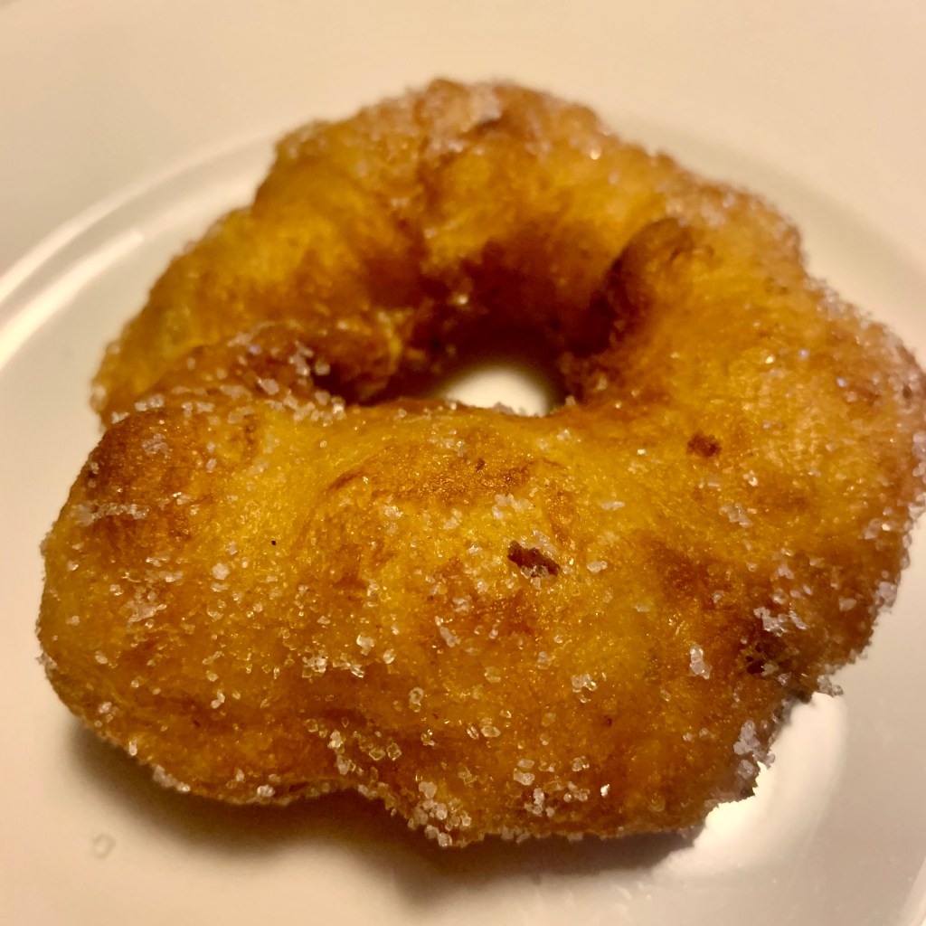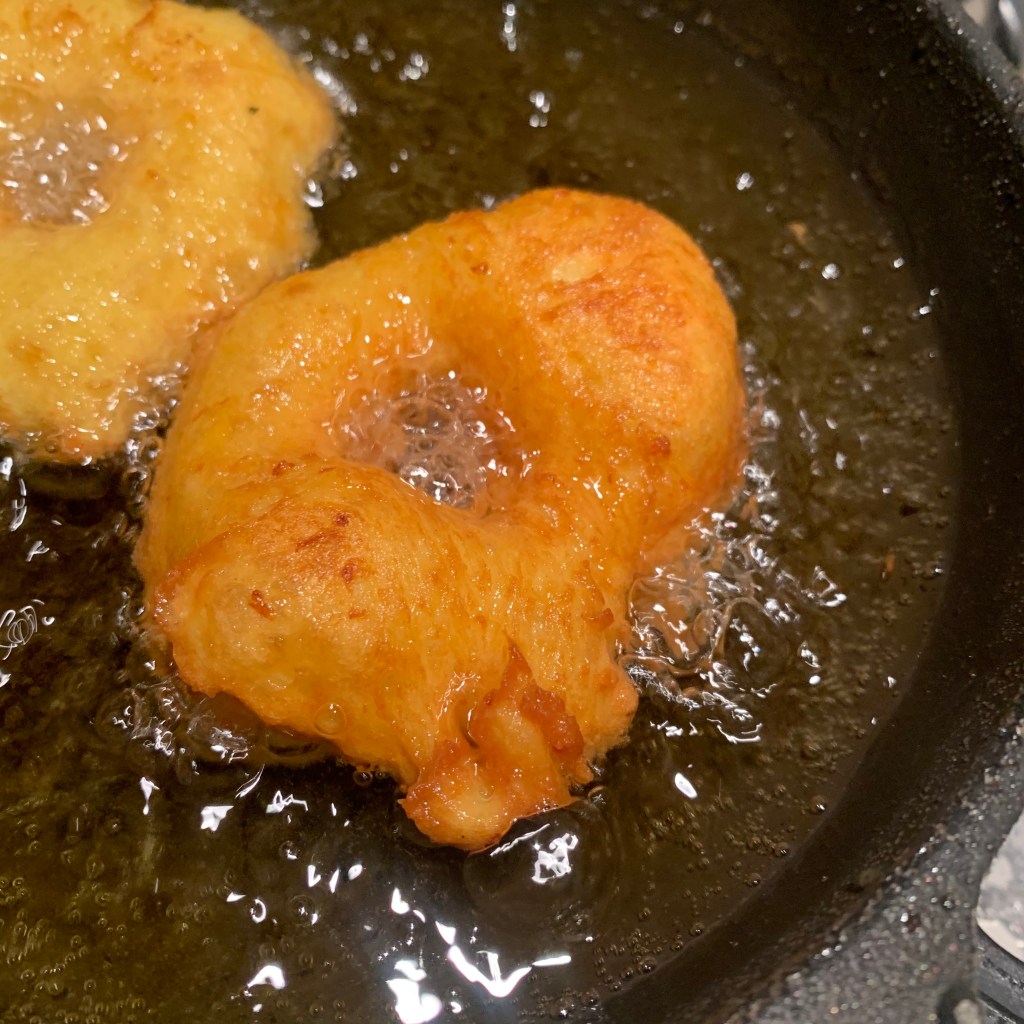 Con le mani bagnate ho preso un poco d’impasto dando la forma della ciambella con il buco, le ho tuffate nell’olio e con un pungi torta ho allargato il buco centrale. Questa operazione non è semplice, solitamente si fa in due: uno prepara la frittella con le mani e la mette a friggere e l’altra persona allarga il buco e le cuoce. Quindi essendo da sola di frittelle tonde con il buco ne sono venute poche.