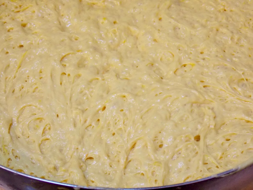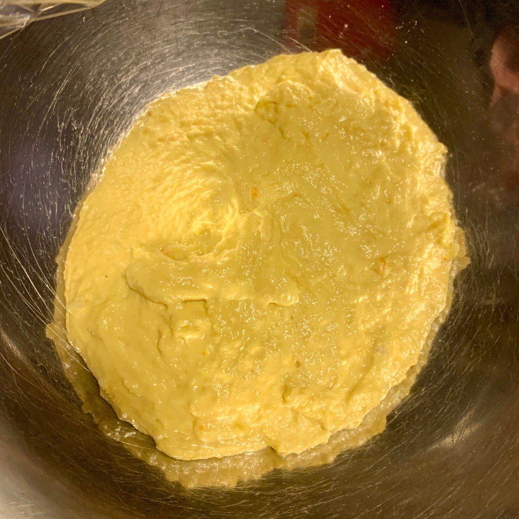 In una ciotola capiente ho amalgamato la farina con tutti gli aromi, ho poi unito le uova sbattute con una forchetta. Ho quindi trasferito tutto nella planetaria e ho montato il gancio. Ho fatto andare a media velocità e pian piano ho aggiunto il latte tiepido, dove avevo sciolto il lievito in precedenza. Ho pian piano aumentato la velocità e impastato per circa 10 minuti, fino ad ottenere un impasto omogeneo e piuttosto molle.