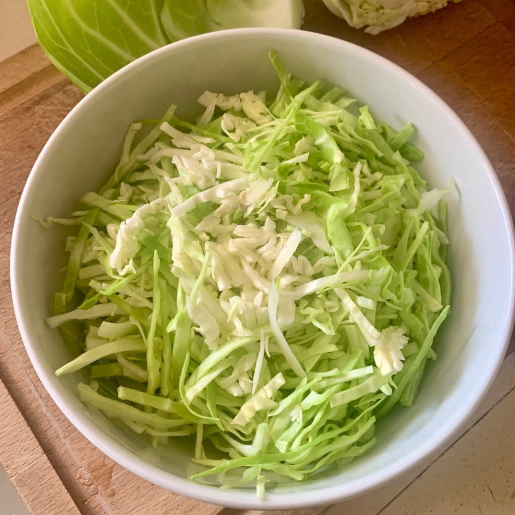 Ho tagliato il cavolo cappuccio finemente a coltello, ‘sbrogliato’ con le dita e messo nell’insalatiera. Nel mixer ho frullato olio extra, sale e pepe, la maionese. Ho condito la verdura per bene e solo alla fine ho messo il cumino. Ho coperto sino al momento di servirla a tavola!