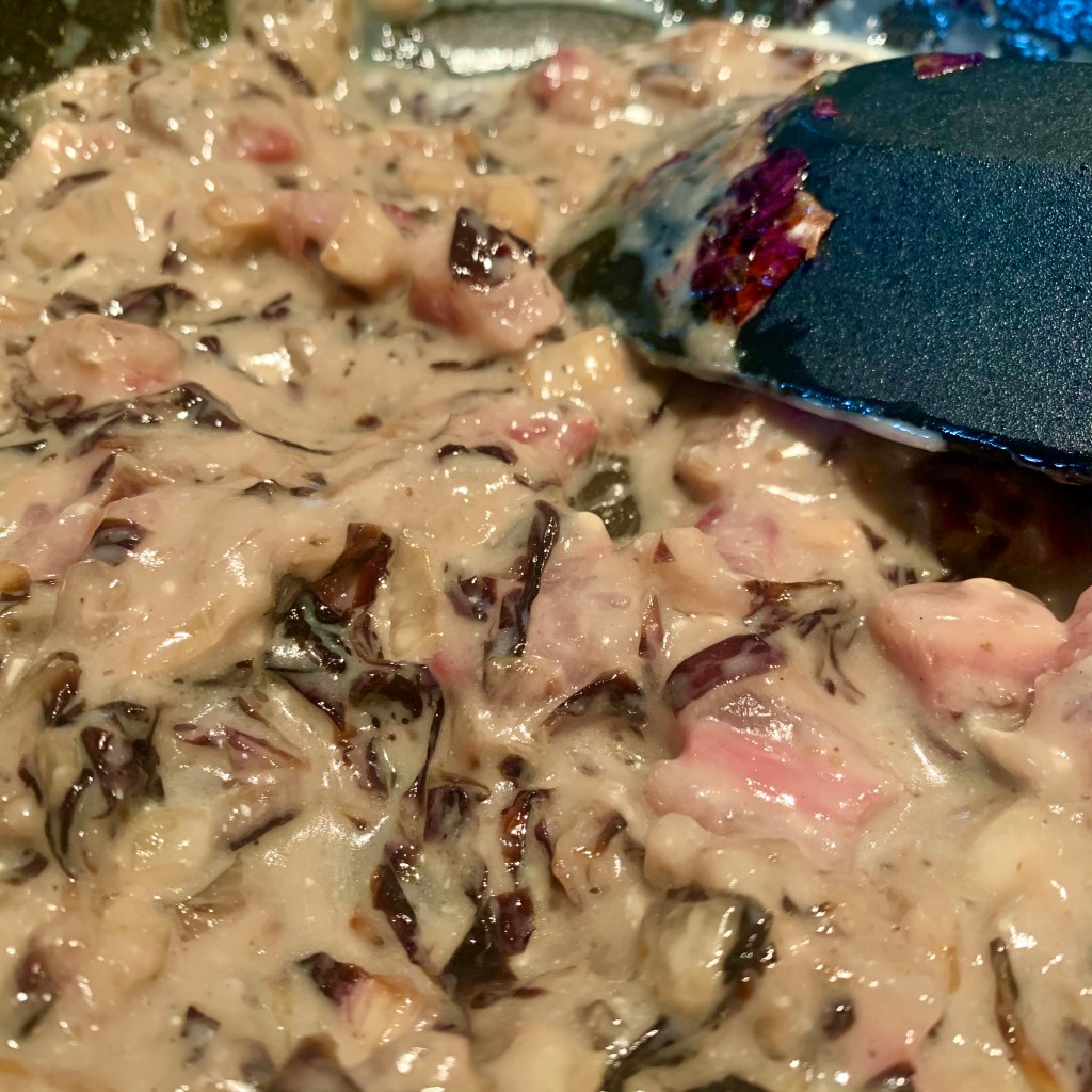 Nel frattempo in un tegamino ho fatto saltare un pò di pancetta affumicata con mezzo cespo di radicchio lungo. Appena la verdura si è ammorbidita ho aggiunto due cucchiai abbondanti di gorgonzola e ho spento il fuoco.