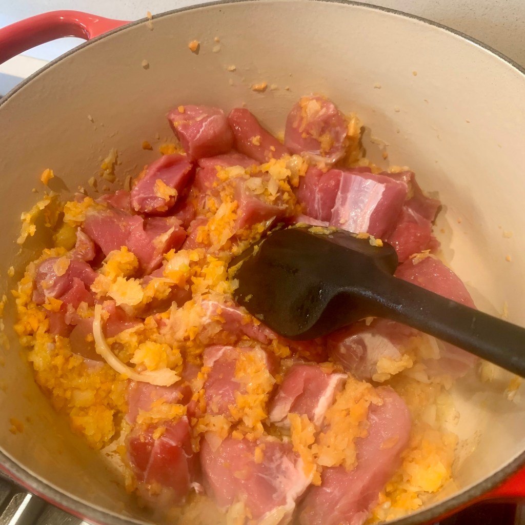 Ho iniziato con il ripieno preparando il trito di cipolla e carote. In una casseruola capiente ho versato un filo d’olio extra e ho unito il trito a fuoco medio. Nel frattempo ho salato e pepato i pezzi di carne. Li ho aggiunti al trito rosolato e ho fatto andare a fuoco più vivace.
