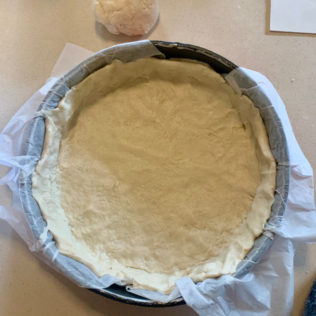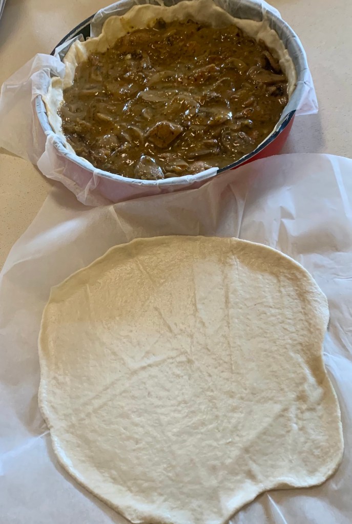 Ho steso 2/3 dell’impasto con l’aiuto della carta forno ed ho foderato la teglia cercando di tenere i bordi alti. Ho quindi versato lo stufato ormai freddo e con il resto dell’impasto ho fatto la copertura.