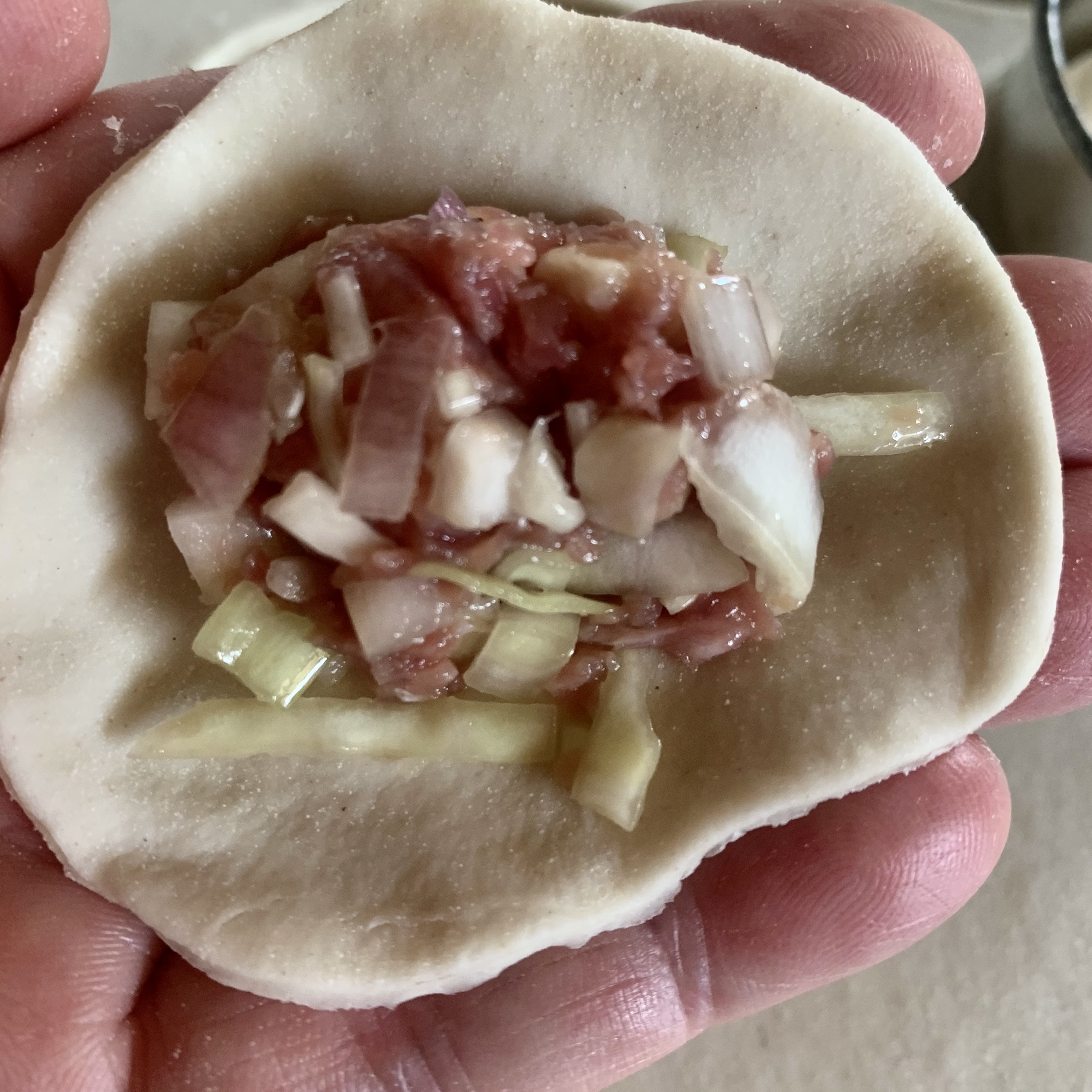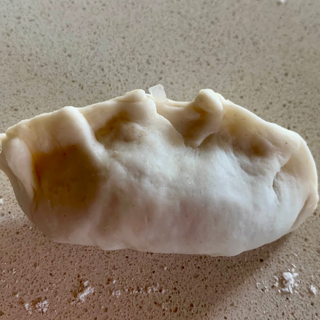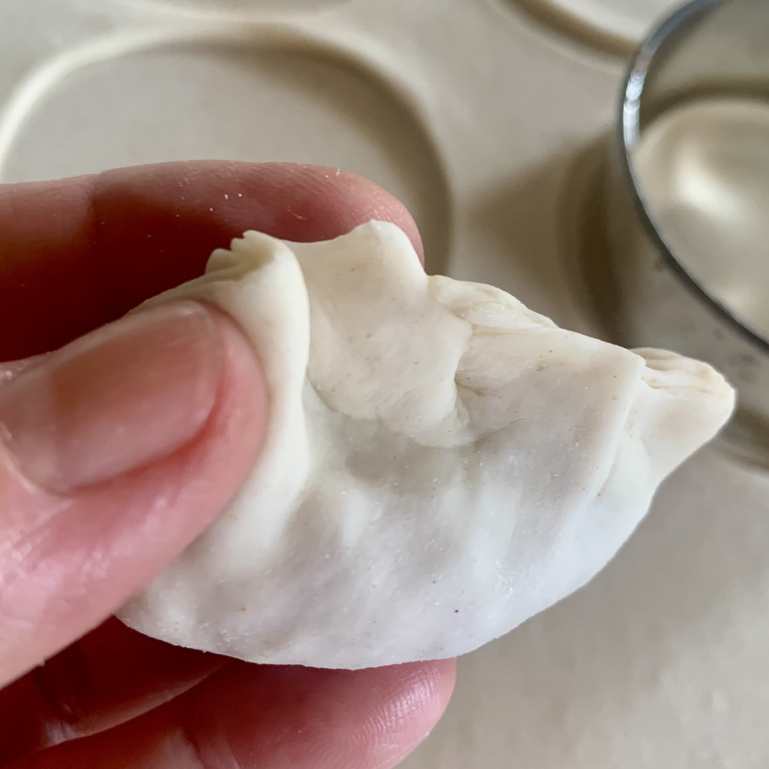 Tenendo il disco di pasta sulla mano ho messo al centro un cucchiaino di ripieno e poi con la punta delle dita ho uniti i lembi schiacciandoli e poi facendo le pieghe sul bordo.