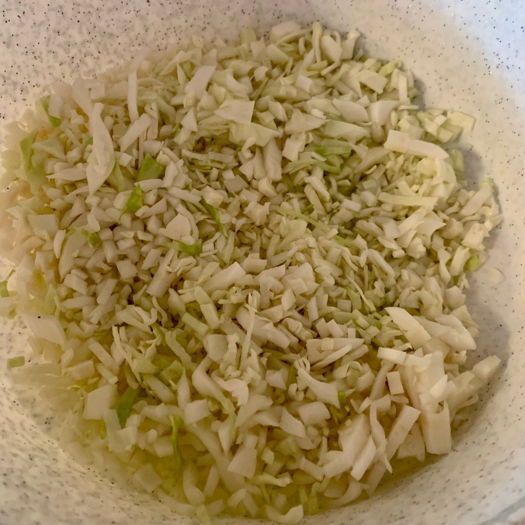 Ho tagliato finemente, molto finemente, il cavolo ed i cipollotti e li ho messi in una ciotola. Ho sgranato con le dita la carne tritata e l’ho unita alla verdura.