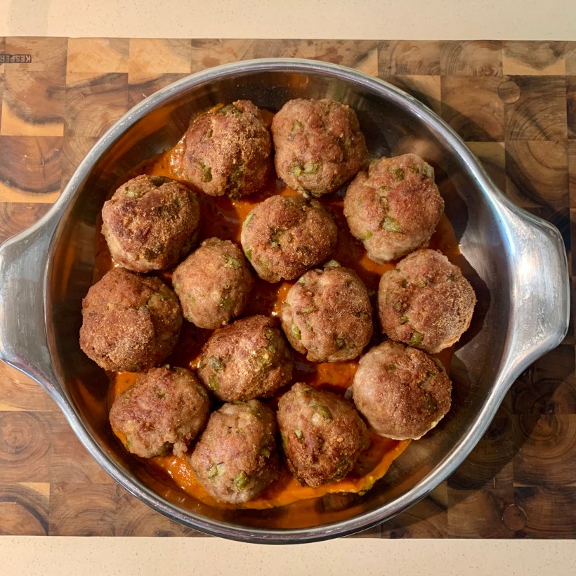 Formo la polpetta: in questo caso dovrà essere grande, al limite di quanto possiate tenerla in una mano. La faccio rotolare sul pan grattato e poi in padella, dove ho fatto scaldare un dito d’olio di semi. Faccio dorare le meat balls in tutte le parti e poi le adagio su un letto di sugo.