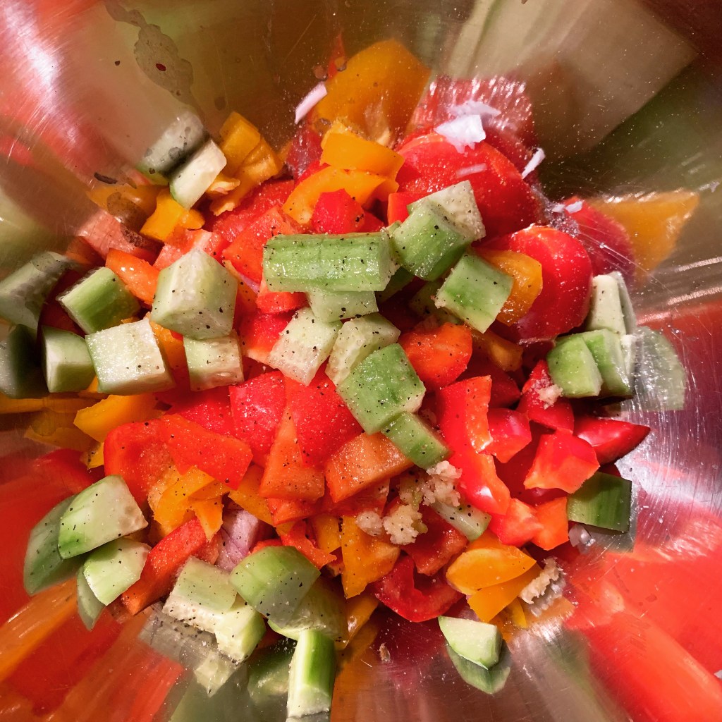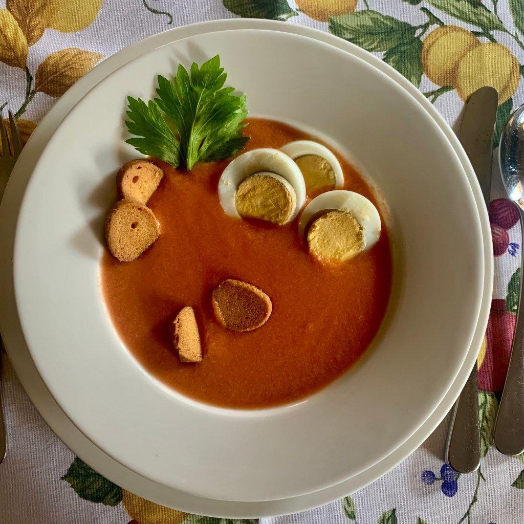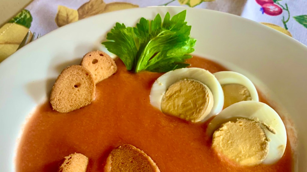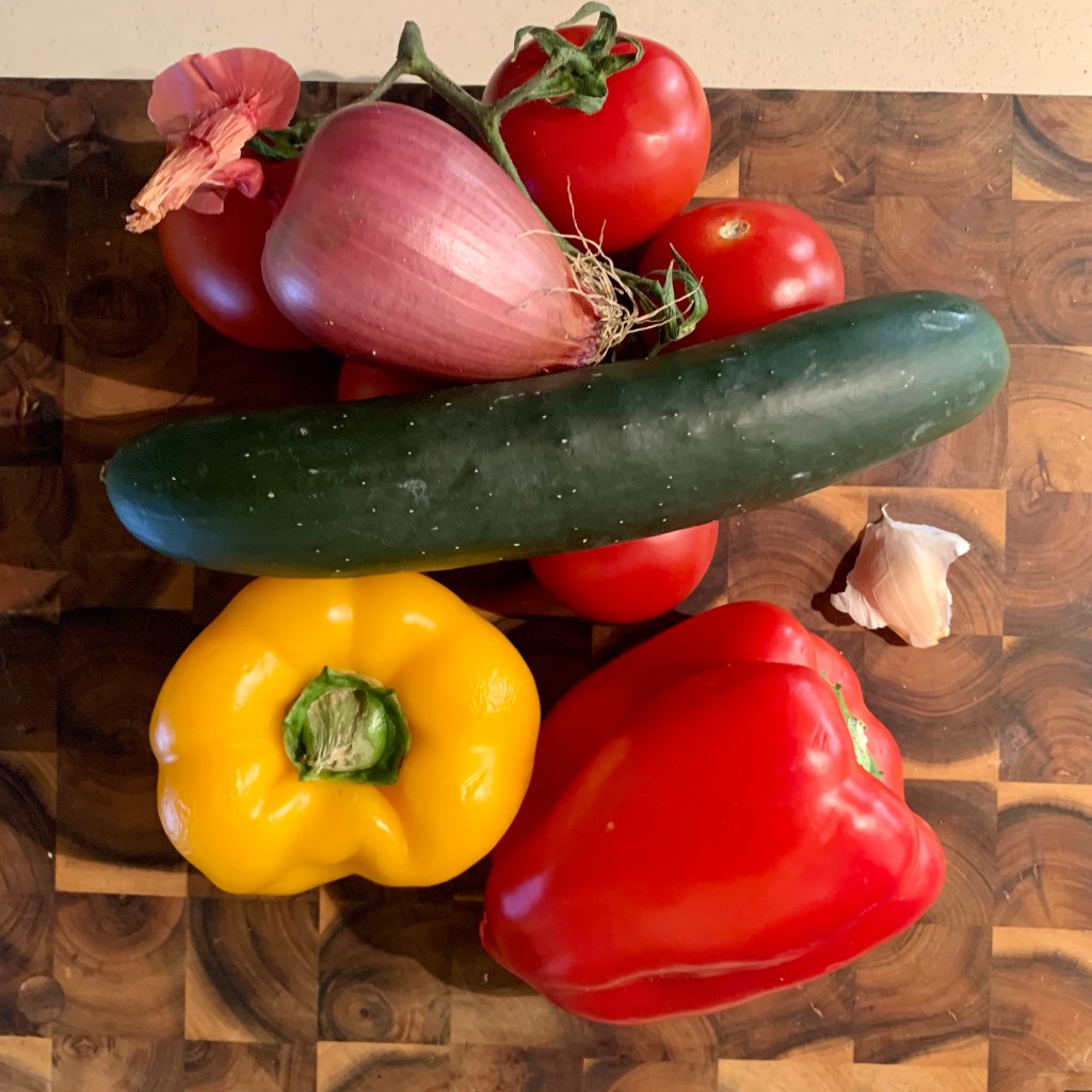 Questa ricetta, originaria della Spagna, ho letto che nasce come piatto povero ma rinfrescante, preparato per i contadini accaldati dal lavoro nei campi. E’ un piatto facilissimo da preparare, sano, adatto ai vegetariani, per una pausa pranzo, un aperitivo, molto rinfrescante quando il caldo incombe, è una goduria anche sorseggiarlo!