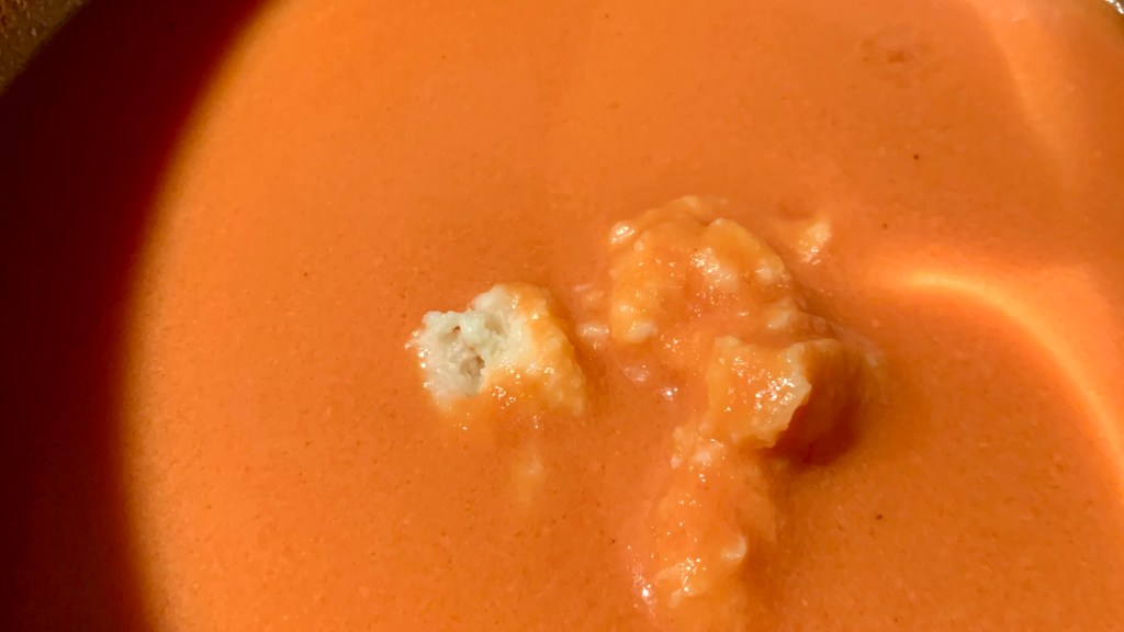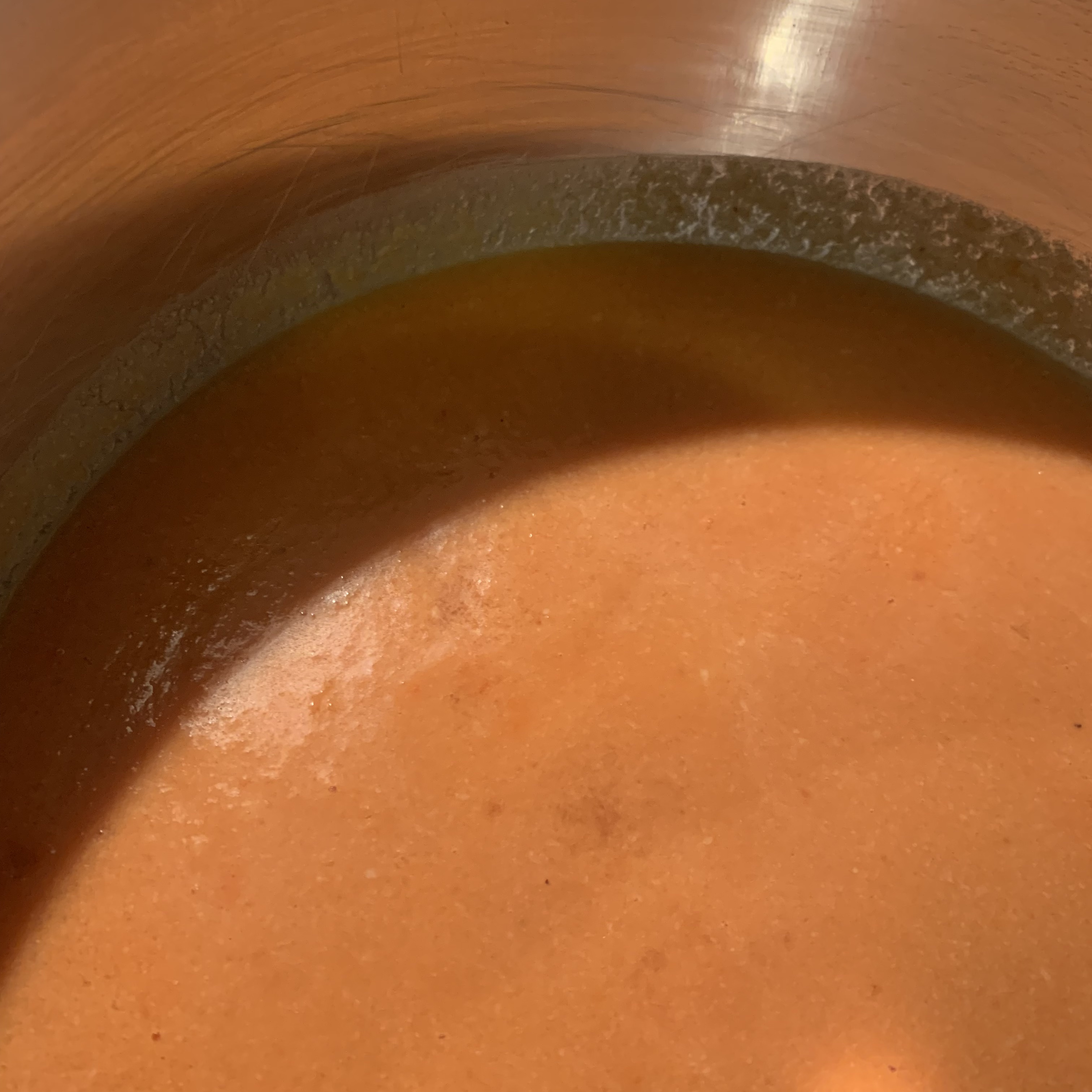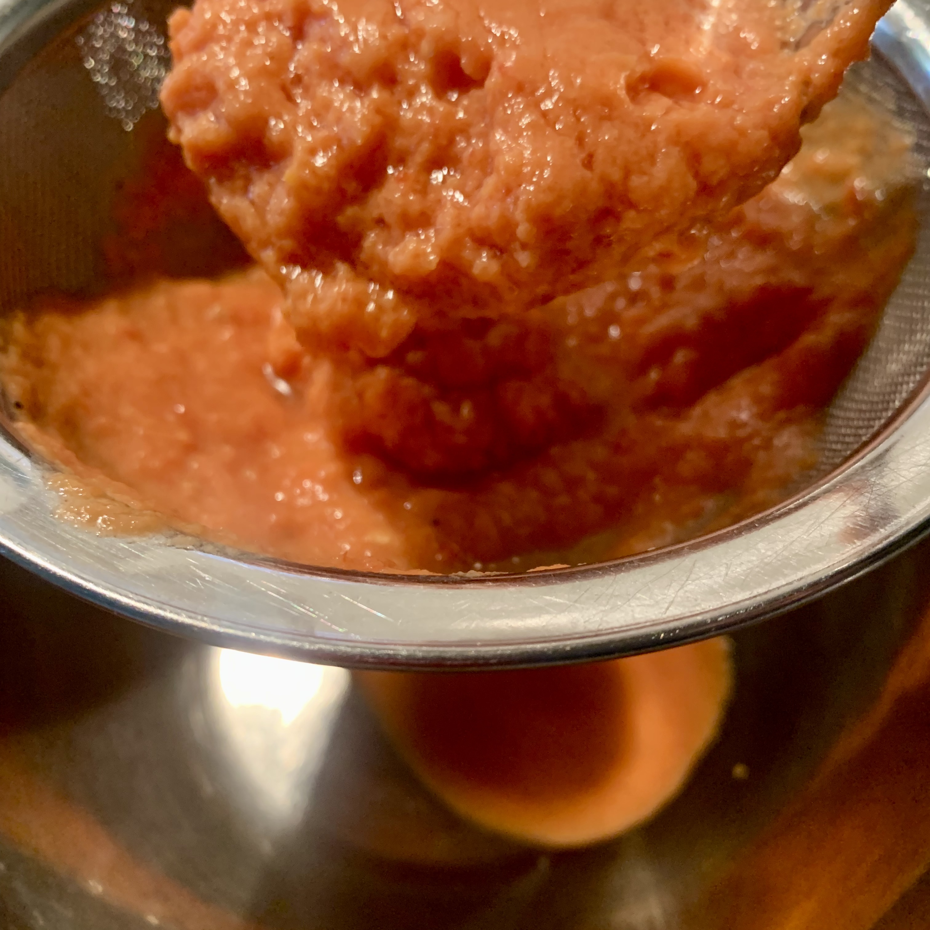 Con un colino e l’aiuto di una spatola ho filtrato la crema, eliminando fibre e i semi dei pomodori.
