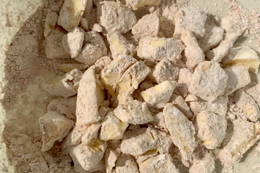 Nel frattempo ho pesato e spezzettato il burro in una ciotola con il sale, lo zucchero e le spezie. Da qui che la farina si è raffreddata il burro era bello morbido e facilmente lavorabile.
