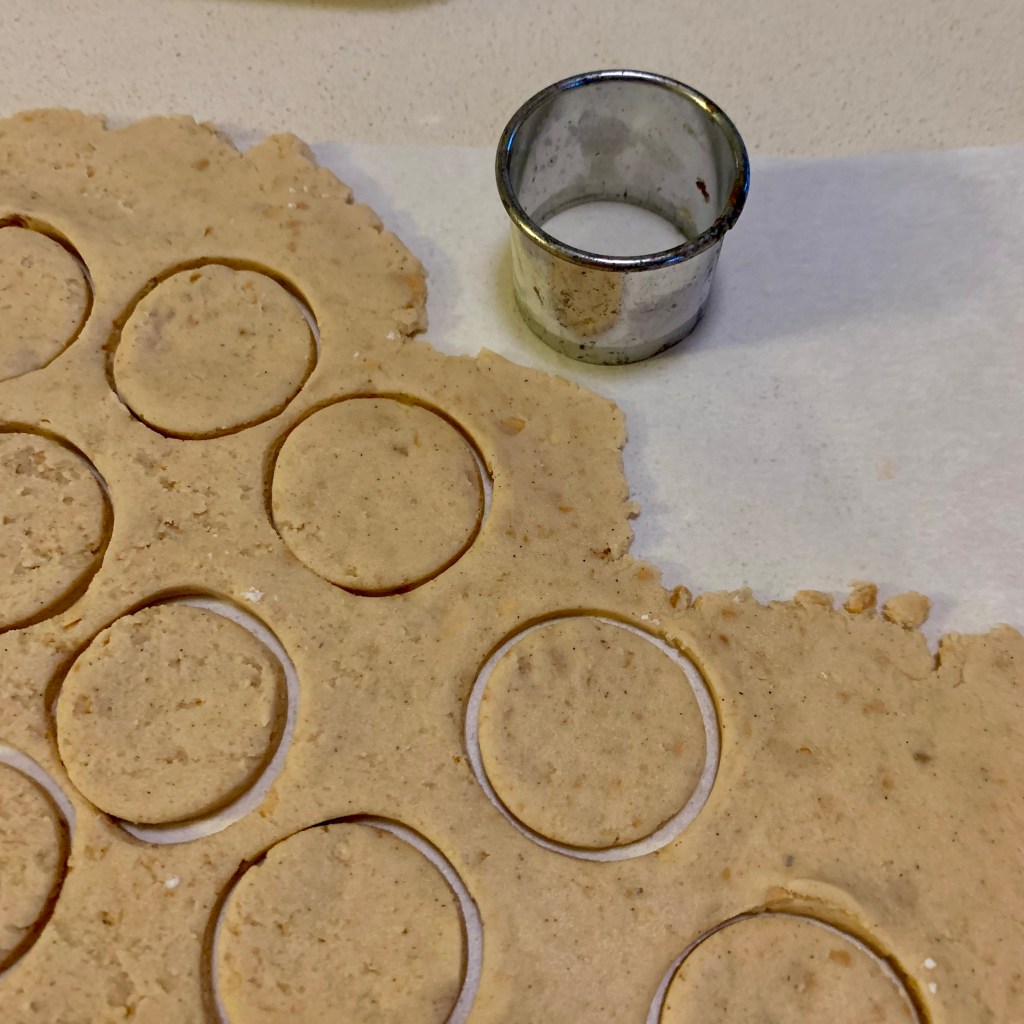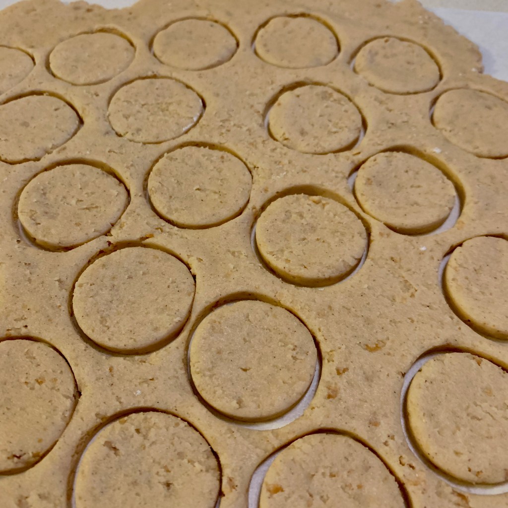 L’ho riposto in frigo a riposare per una decina di minuti. Con l’aiuto di due fogli di carta forno ho steso con il matterello l’impasto non troppo sottile e con un piccolo coppa pasta ho ricavato i biscotti.