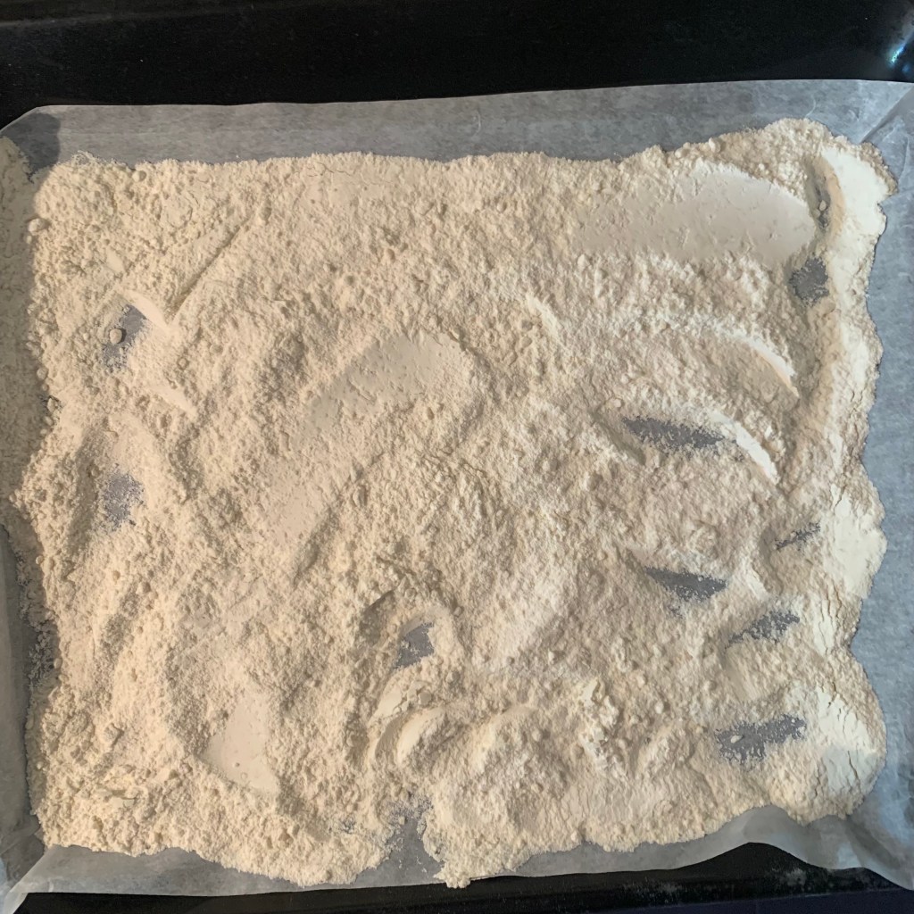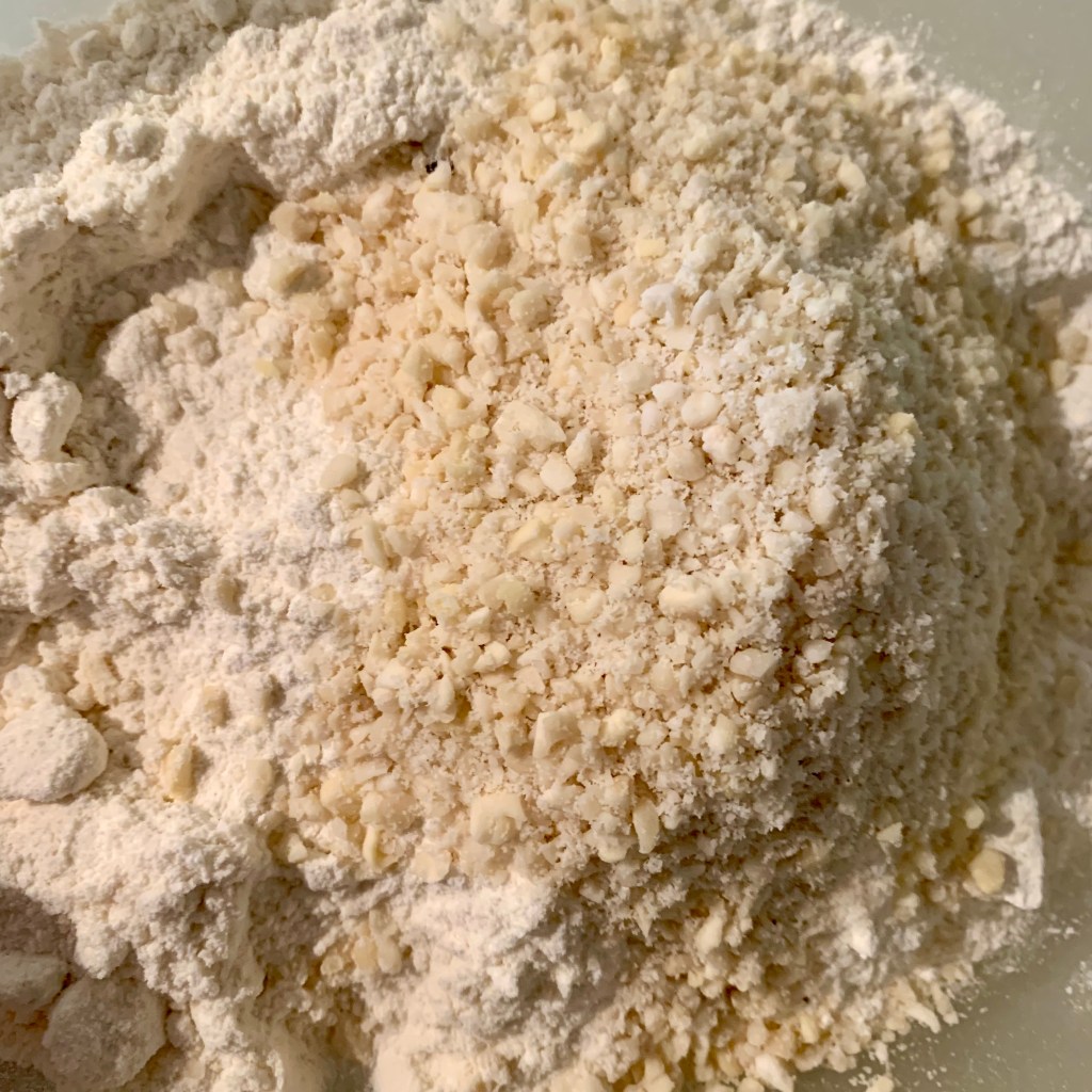 L’altra particolarità che mi ha colpito è che la farina e le mandorle tritate vanno tostate in forno o in padella prima di essere usate… strano no?