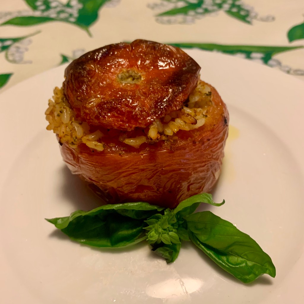 Nel frattempo fodero una pirofila con la carta forno, ungo il fondo con poco olio e sistemo i ‘gusci’ di pomodoro. Appena pronto il riso riempio bene i pomodori, copro con i ‘coperchi’ e inforno a 180 gradi (ventilato) per circa 50 minuti. Potete rubare qualche chicco per sentire la cottura dopo 45 minuti e regolarvi.