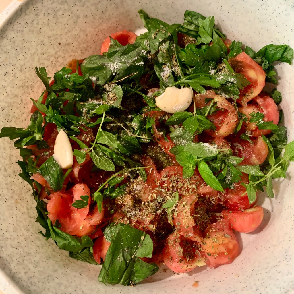 Nella ciotola aggiungo tutto il resto: gli aromi e un giro di olio. Frullo tutto con il minipimer ad immersione.