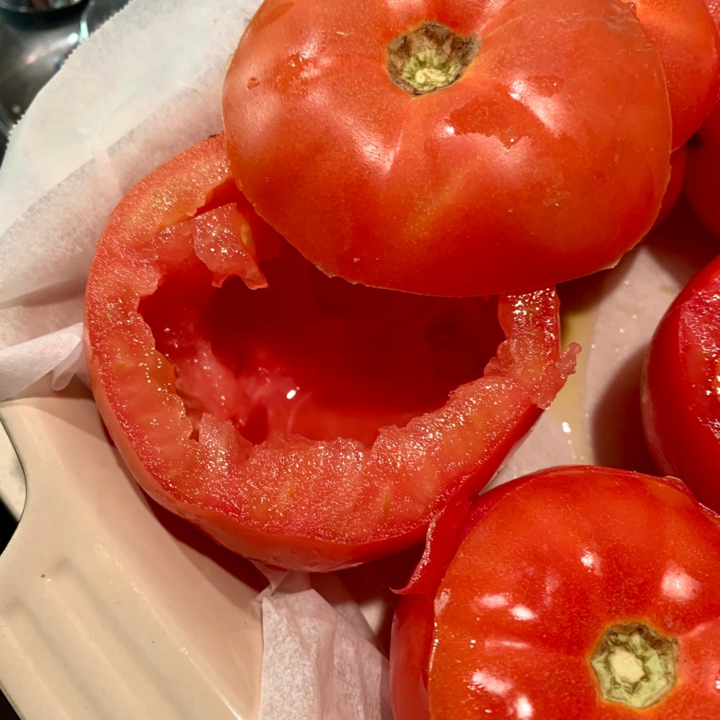 Prima di tutto lavo bene i pomodori, taglio la parte più alta (coperchio) e li scavo svuotandoli della loro polpa, raccogliendola in una ciotola capiente.