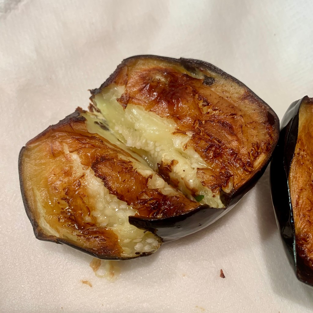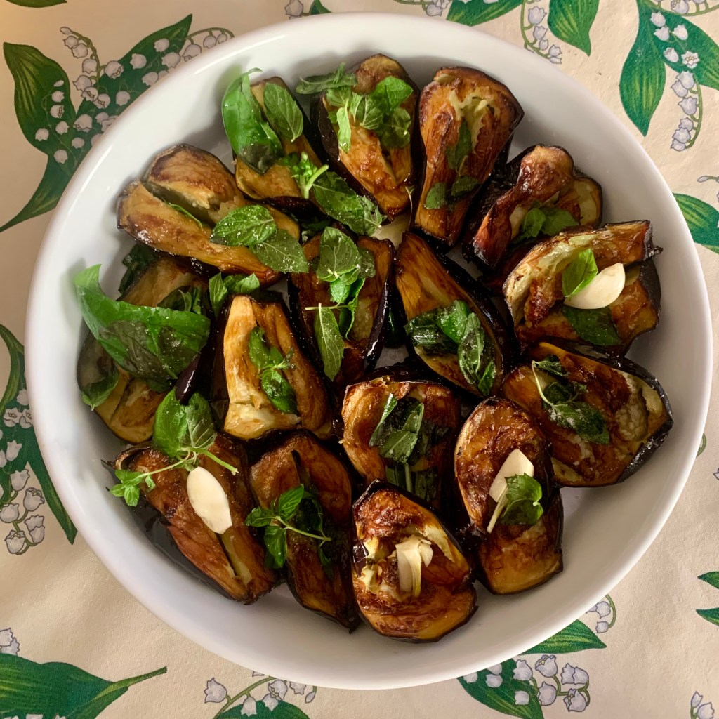 Intanto ho preparato il piatto da portata con gli spicchi d’aglio tagliati in due, il basilico e la menta sminuzzati con le dita e un giro di olio buono. Ho scolato bene le melanzane sulla carta assorbente e le ho sistemate sul piatto da portata ancora calde.
