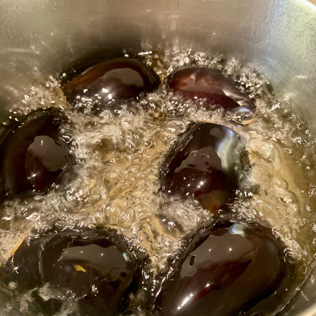 Ho messo un tegame dai bordi alti con olio per frittura sul fuoco. Nel frattempo che raggiungeva la temperatura giusta ho aperto in due, per lungo, le melanzane ben lavate e asciugate. Avrei dovuto salarle e metterle a scolare, lo so, ma non avevo tempo e sono andata direttamente a friggerle! Prima dalla parte della buccia e poi dalla parte della polpa.