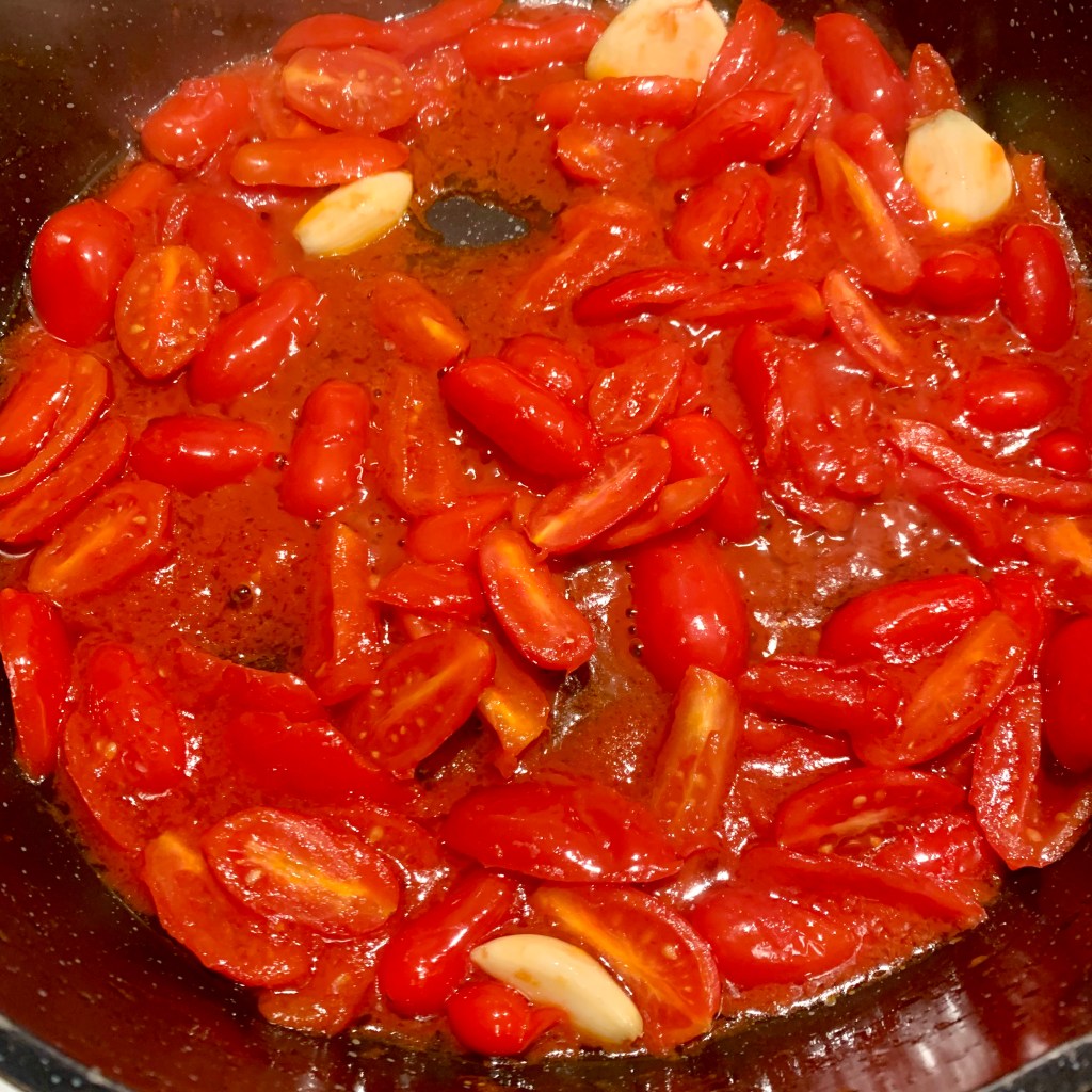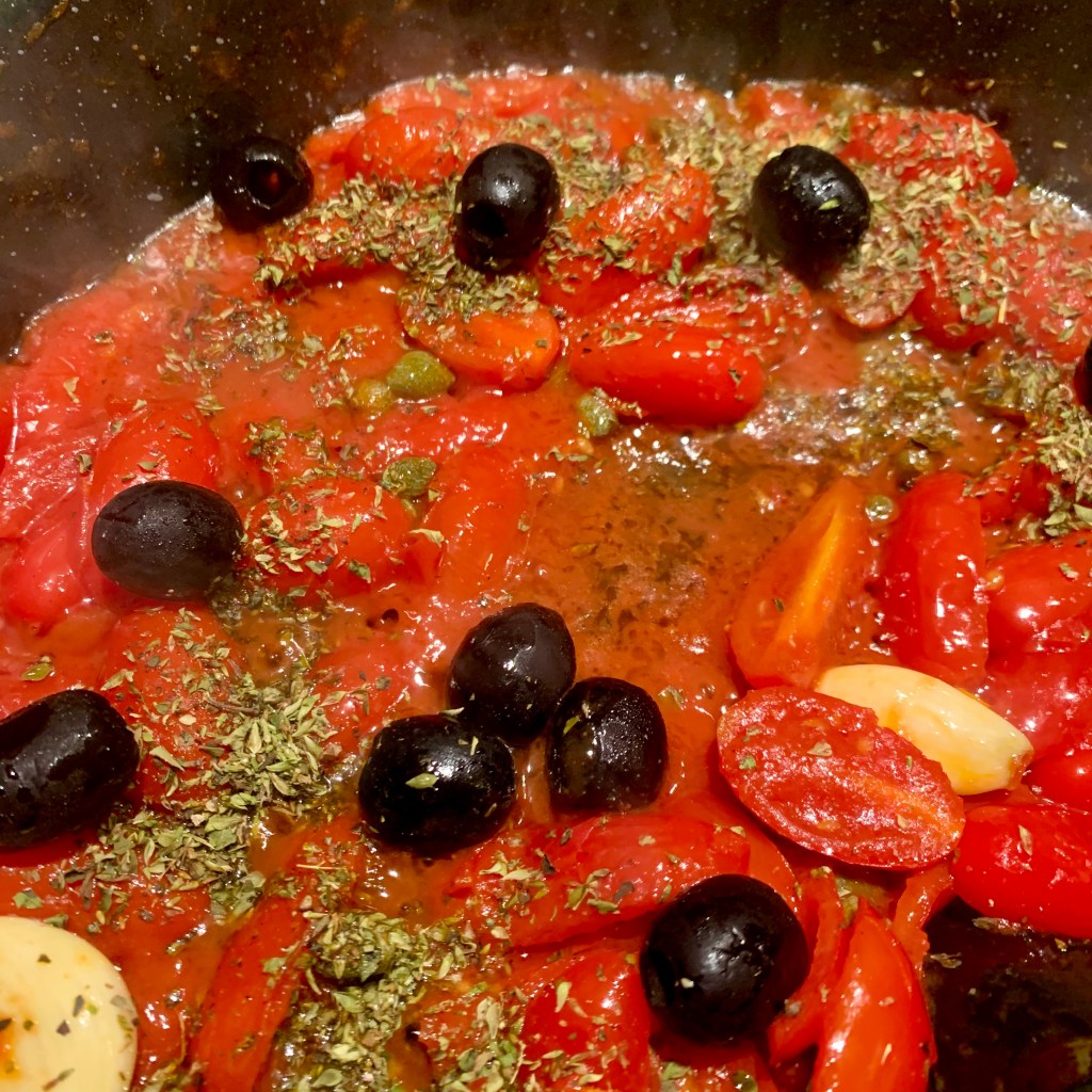 Per prima cosa ho messo l’acqua per la pasta sul fuoco. In attesa che arrivasse a bollore, in una larga padella, ho fatto rosolare l’aglio intero. Quando ha preso colore ho aggiunto i pomodorini tagliati a metà. Ho lasciato i capperi a bagno nell’acqua, gli ho risciacquati, strizzati con le dita ed aggiunti al pomodoro. Ho unito le olive e infine la salsa di pomodoro. Non ho salato, ci pensano i capperi!