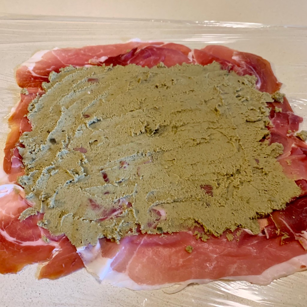 Ho steso quindi un foglio di pellicola trasparente sul piano di lavoro, ho disposto le fette di prosciutto crudo formando un rettangolo e sopra ho spalmato la crema di funghi.