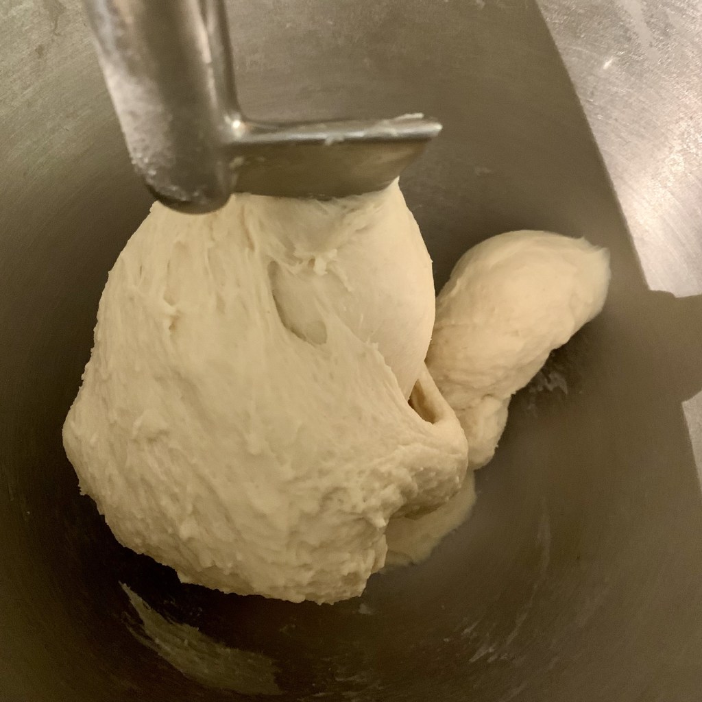 Ho miscelato inizialmente la farina con lo zucchero, il latte ed il sale nella planetaria. Ho aggiunto poi l’uovo continuando a impastare a media velocità. Infine ho unito il lievito e ho impastato a lungo, sino a che l’impasto non risale sul gancio (incordatura).