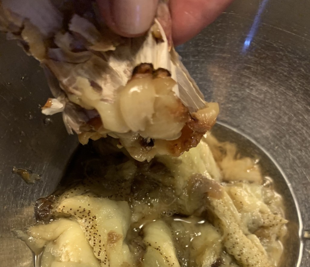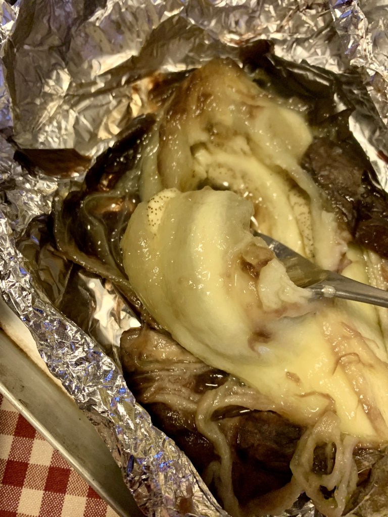 Ho impacchettato ogni melanzana nell’alluminio, cosi’ anche la mezza testa d’aglio. Li ho cotti in una teglia in forno per circa 1 ora a 180 gradi.