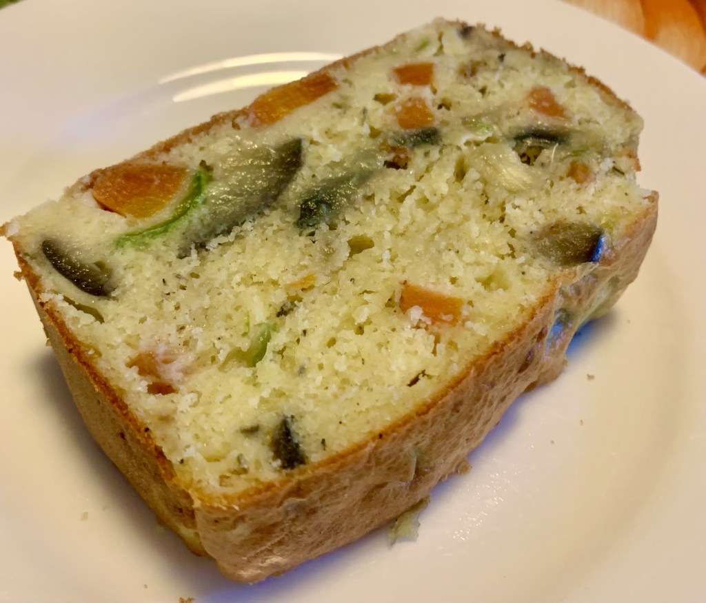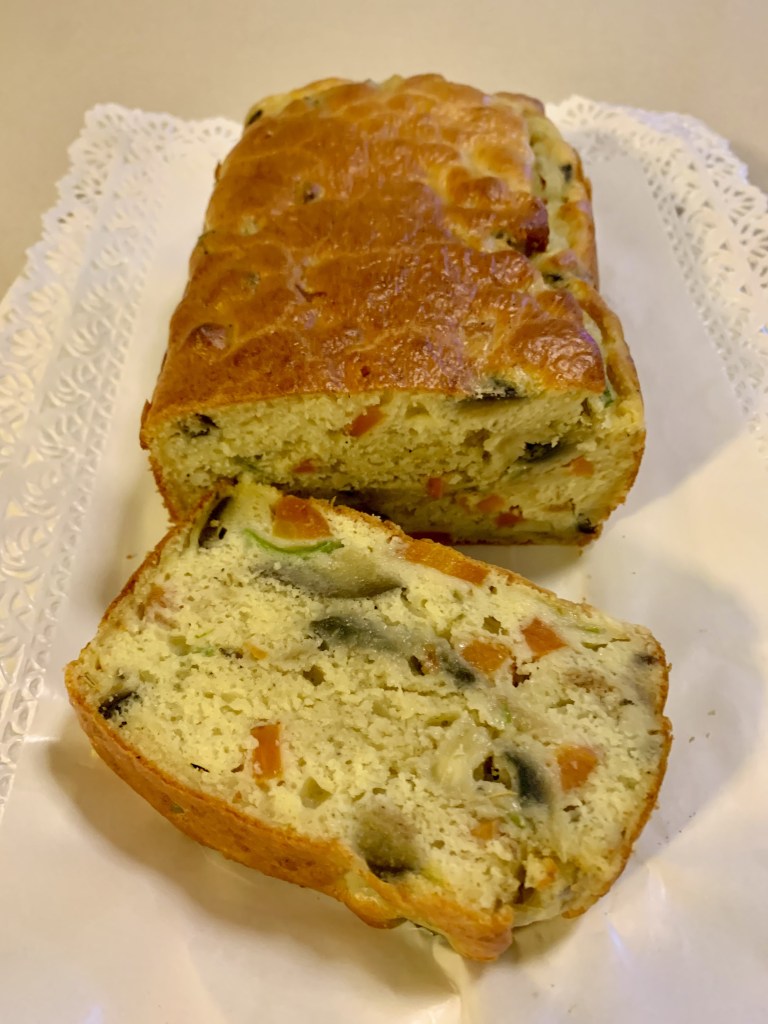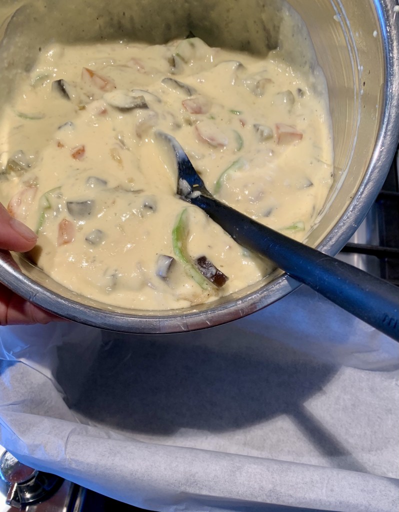 Ho aggiunto le verdure rosolate e poi ho rovesciato il tutto nella teglia da plum cake foderata di carta forno.