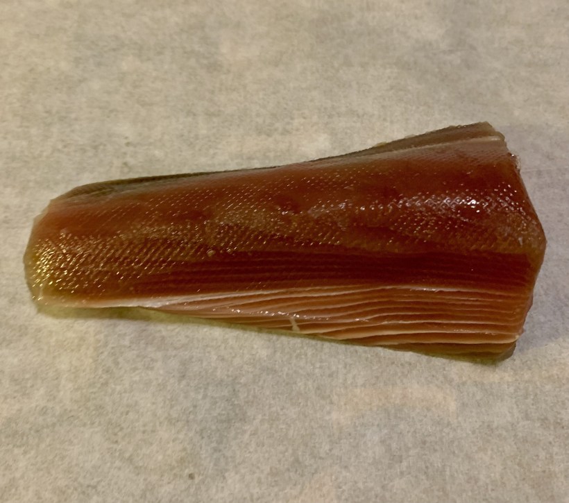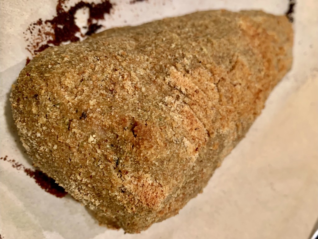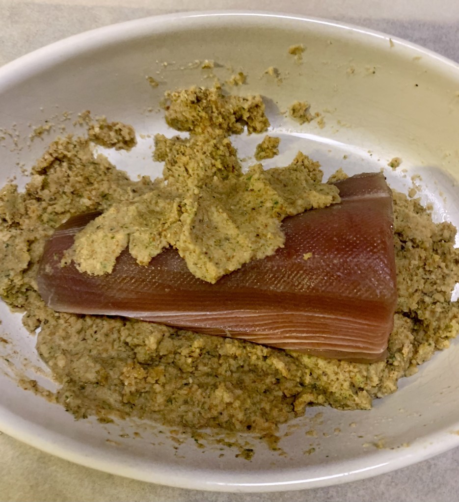 Ho ottenuto una pastella spessa, morbida e profumatissima. Ho interamente avvolto il tonno con questa crema, compattandola bene con le mani.