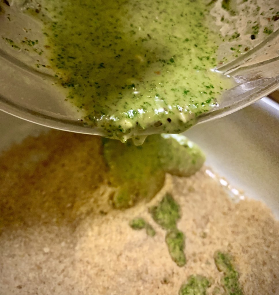 Nel mixer ho messo tutti gli aromi con qualche cucchiaiata di acqua per aiutare la sminuzzatura, poi un filo d’olio. Ho ottenuto una sorta di ‘pesto’ piuttosto liquido che ho amalgamato al pangrattato.