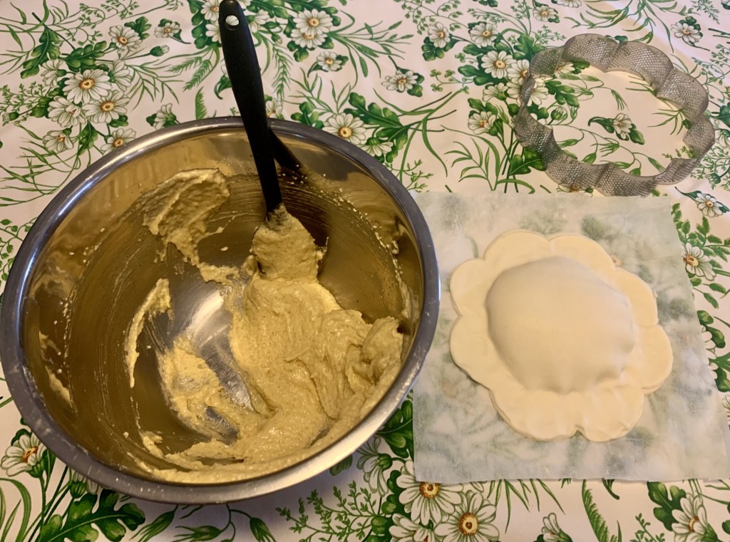 Ho steso il primo disco di pasta sfoglia e ho dato una forma usando un ring a forma di fiore. Ho farcito generosamete con la crema il centro. ho inumidito leggermente i bordi e adagiato il secondo ‘fiore’ di pasta sfoglia sigillando bene i bordi.